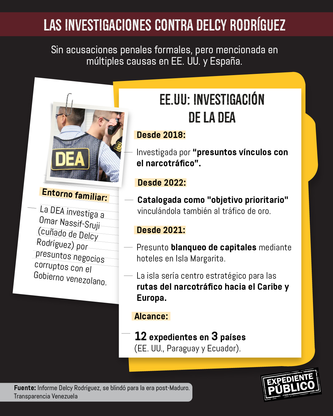 El poder de la presidenta interina de Venezuela, Delcy Rodríguez, es el centro de una investigación independiente realizada por la organización civil Transparencia Venezuela, que analiza tanto los lazos políticos y económicos como las denuncias de corrupción que acumuló a lo largo de su carrera.