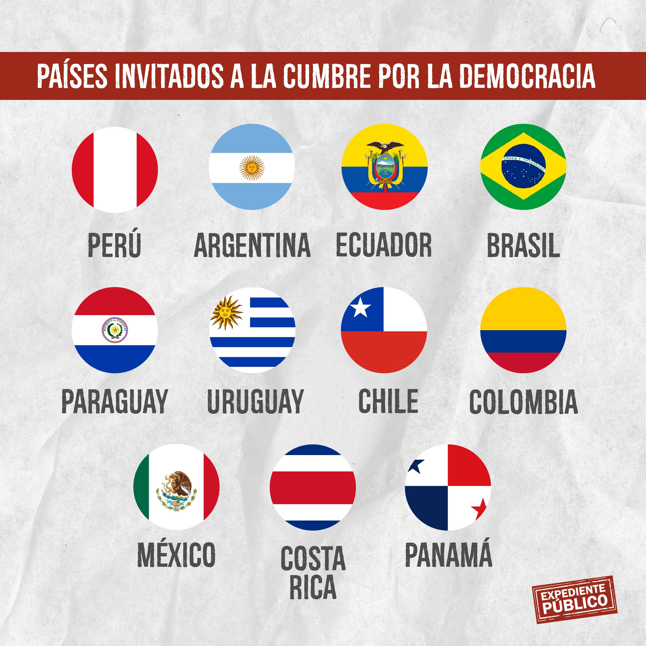 Brasil, Argentina, Chile, Colombia, Ecuador, México, Paraguay, Perú, Costa Rica, Ecuador. México, Panamá, Paraguay, Perú y Uruguay aparecen en la lista de países de las Américas invitados a participar, pero fueron excluidos Venezuela, Cuba, Nicaragua, Bolivia, Guatemala y El Salvador.