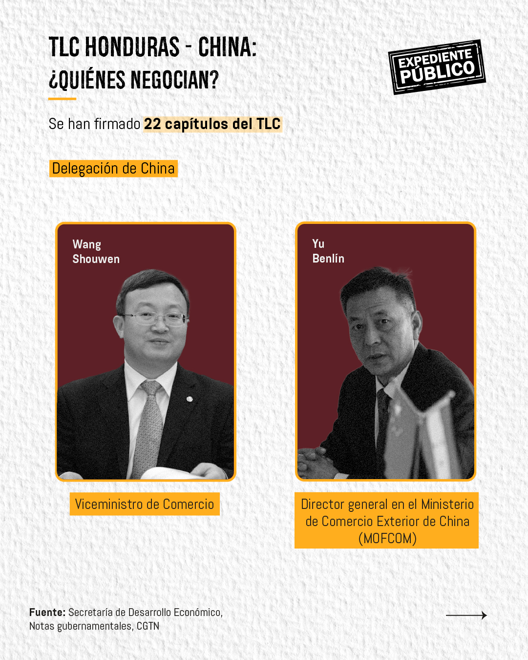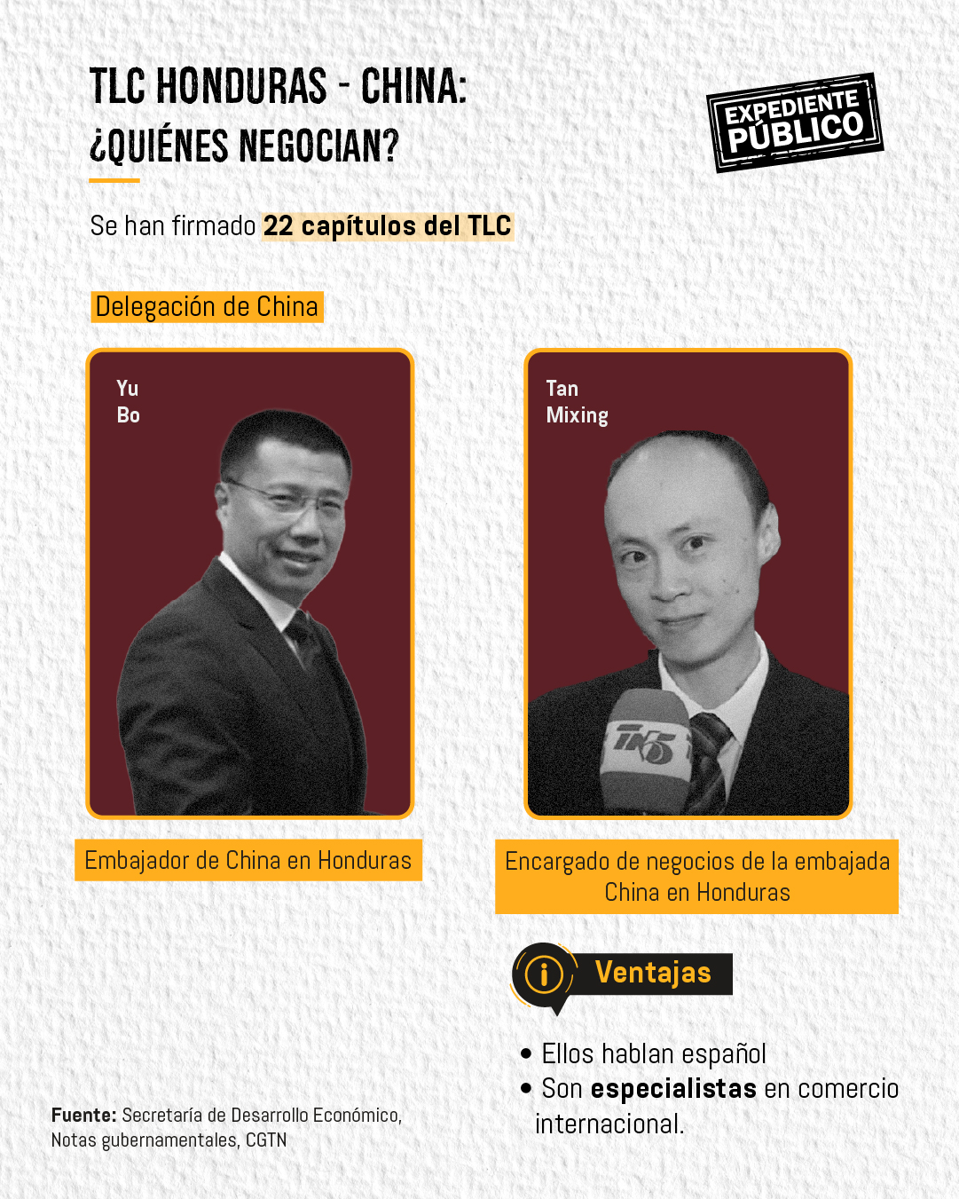 Otras personas dentro de la delegación negociadora son Tan Mixing, encargado de negocios de la Embajada de China en Honduras y Yu Bo, embajador de China en Honduras. Además de los representantes de 30 empresas chinas.