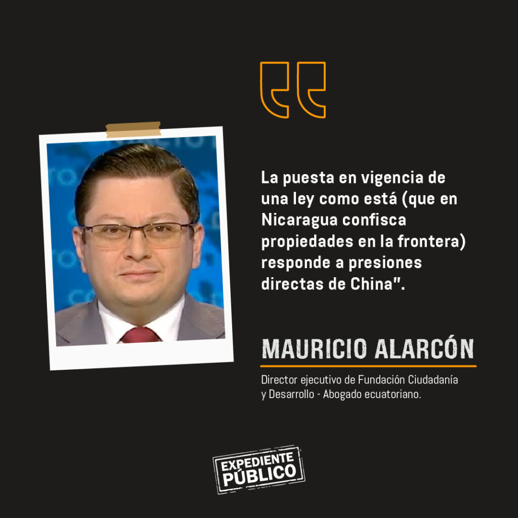 El abogado ecuatoriano Mauricio Alarcón, de la Fundación Ciudadanía y Desarrollo, en entrevista con Expediente Público, señaló que la nueva Ley Fronteriza de Nicaragua es confiscatoria, atenta contra la propiedad y responde a los intereses de China.
