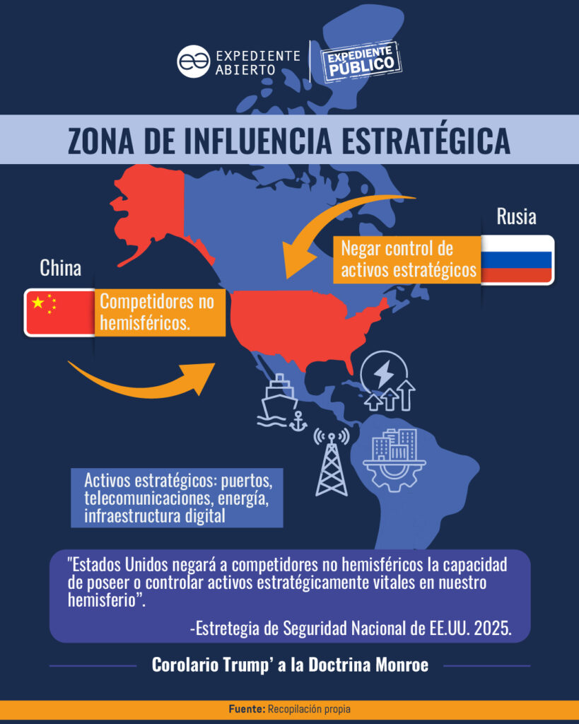 La Estrategia identifica a China y Rusia como actores extrarregionales que compiten con Estados Unidos por influencia política, económica y estratégica en el hemisferio occidental, y propone la necesidad de revertir esa presencia cuando afecte los intereses considerados vitales por la administración Trump.