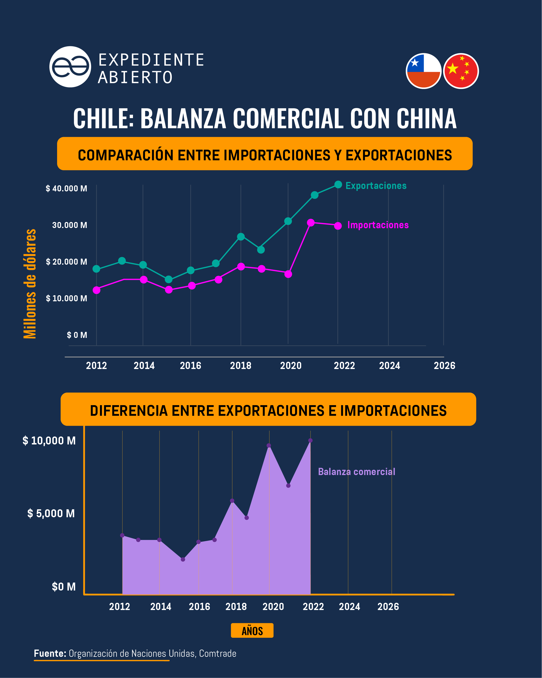 Las exportaciones a China crecieron tanto en esos años que, en 2022, este país desplazó a Estados Unidos como el principal destino de las exportaciones no petroleras. Ese año, la venta de estos productos a China llegó a los USD5,706 millones, mientras que, a Estados Unidos, a USD4,357 millones.
