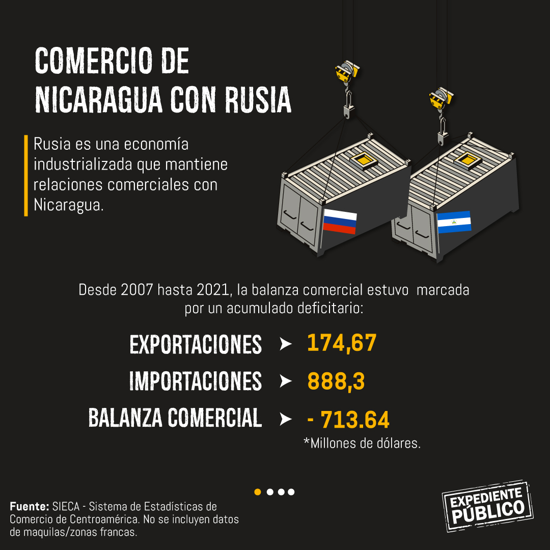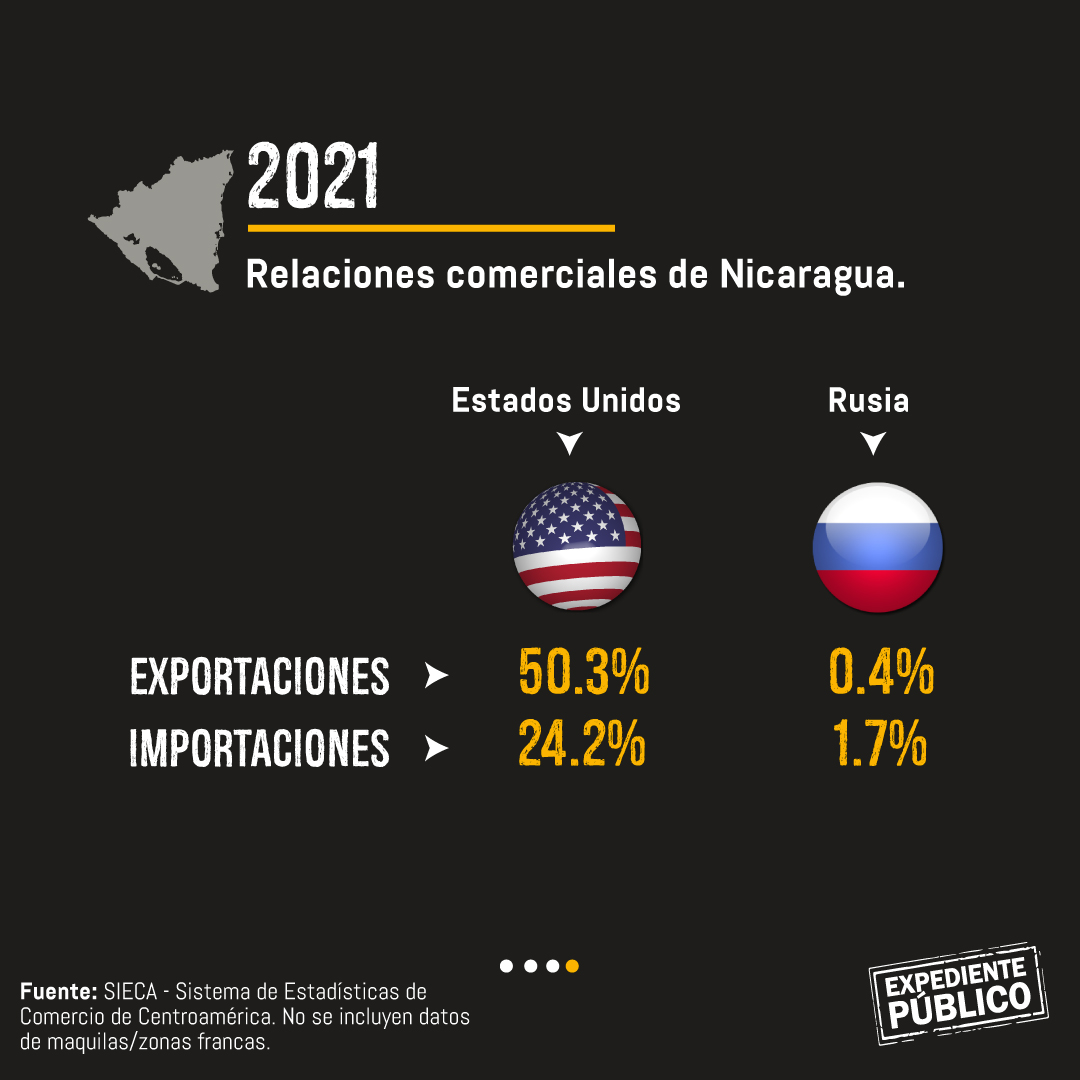 En 2020, Nicaragua exportó poco más de $6 millones a Rusia, mientras que en 2021 la cifra alcanzó los $13.3 millones, es decir el 0.04% del total de las exportaciones.