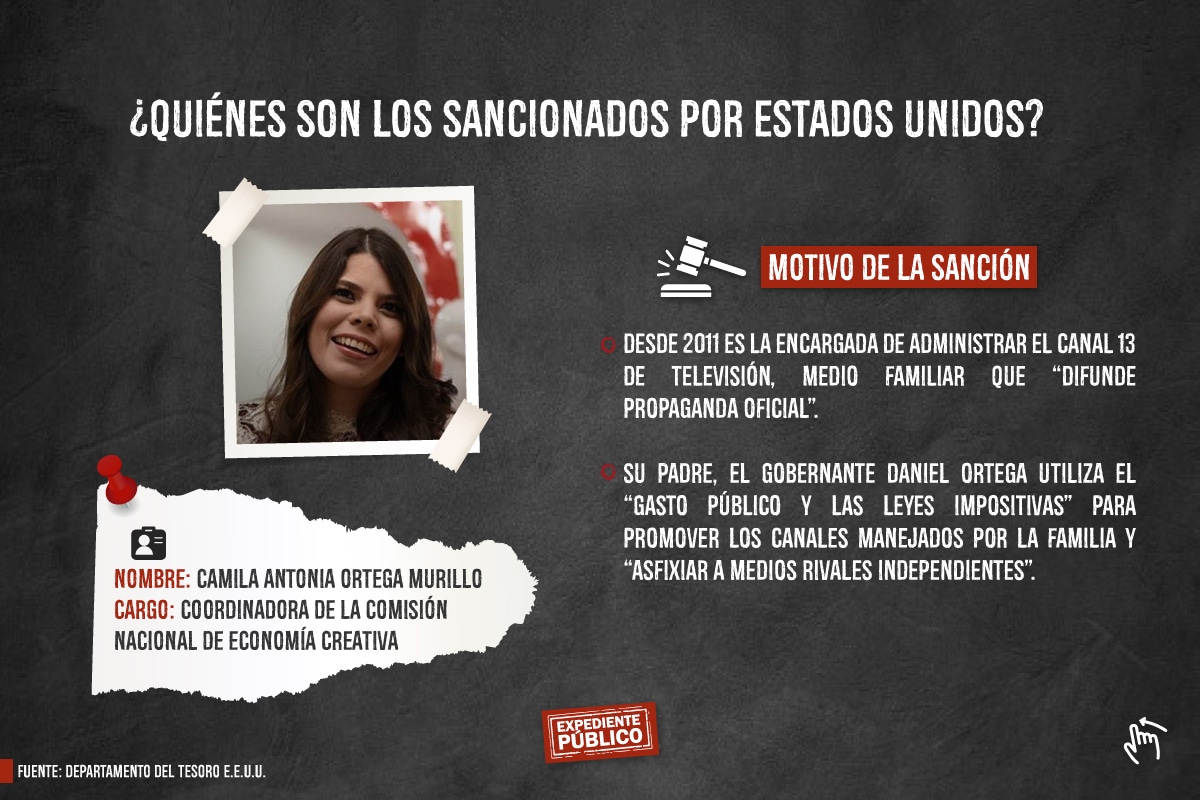 El Departamento de Estado de Estados Unidos dio a conocer esta semana sanciones contra cuatro funcionarios nicaragüenses, entre ellos la hija de la pareja presidencial, Camila Ortega Murillo a quien identifican como Coordinadora de la Comisión de Economía Creativa y una “asesora clave” dentro del gobierno.