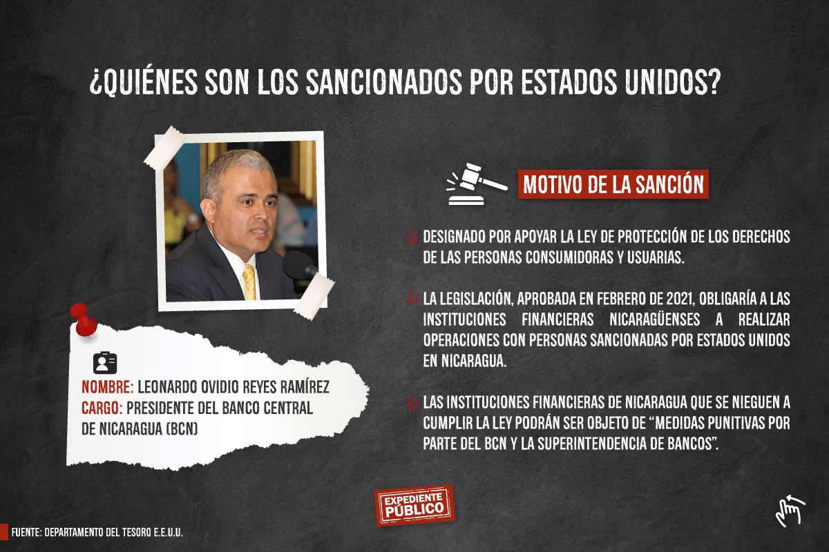 Las sanciones emitidas también alcanzaron al diputado y coordinador de la bancada del Frente Sandinista de Liberación Nacional (FSLN) en la Asamblea Nacional (parlamento), Edwin Castro; al presidente del Banco Central de Nicaragua (BCN), Ovidio Reyes; y al director del Instituto de Previsión Social Militar (IPSM), general de Brigada del Ejército, Julio Rodríguez Balladares. Con ellos son unos treinta funcionarios nicaragüenses sancionados por EE.UU.