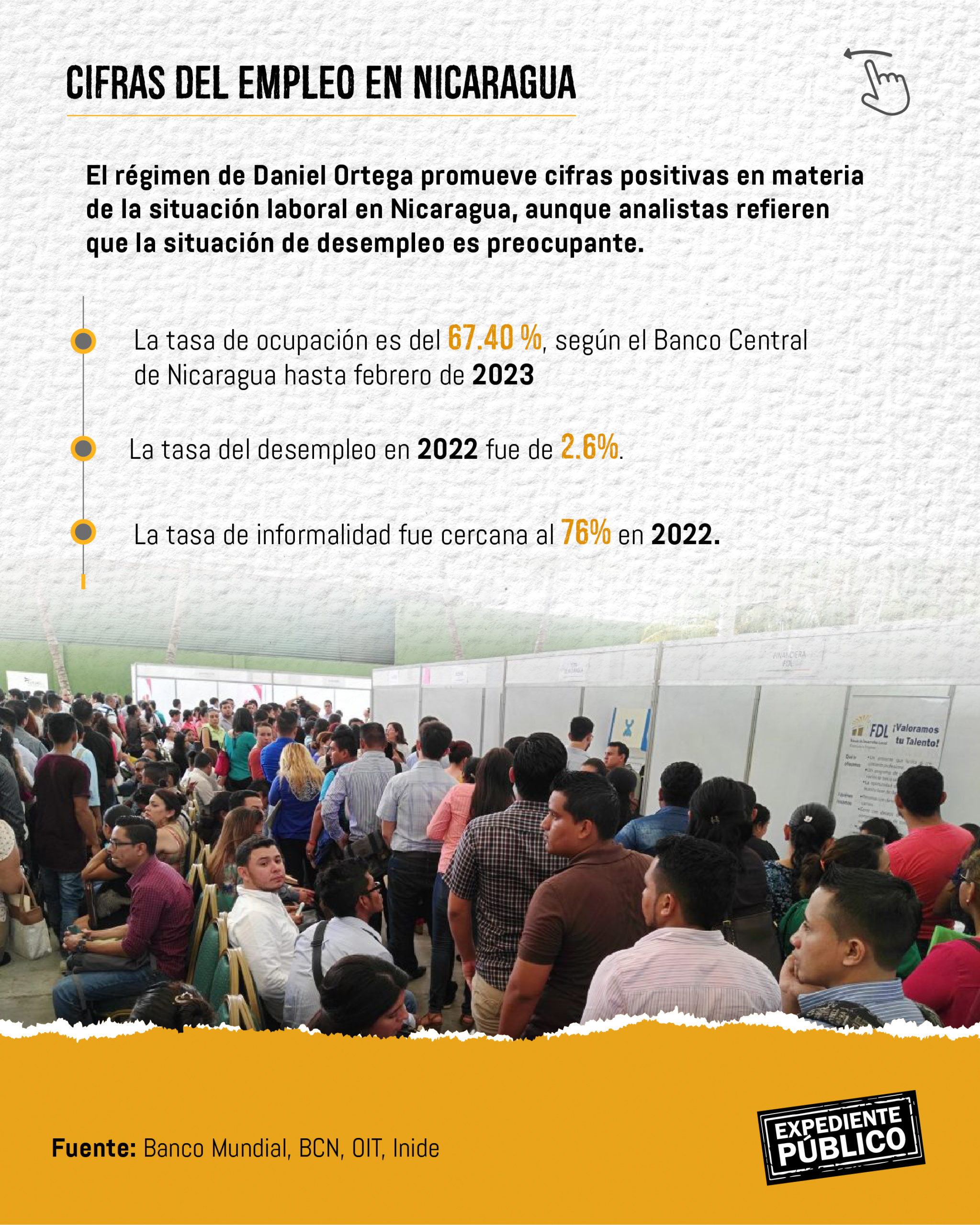 Según datos del Banco Central de Nicaragua, la tasa de ocupación laboral en Nicaragua es del 67.40% hasta febrero de este año. La entidad, además, señaló que, en 2022, la tasa del desempleo fue de 2.6%, en 2022 y la tasa de informalidad fue cercana al 76% en 2022.