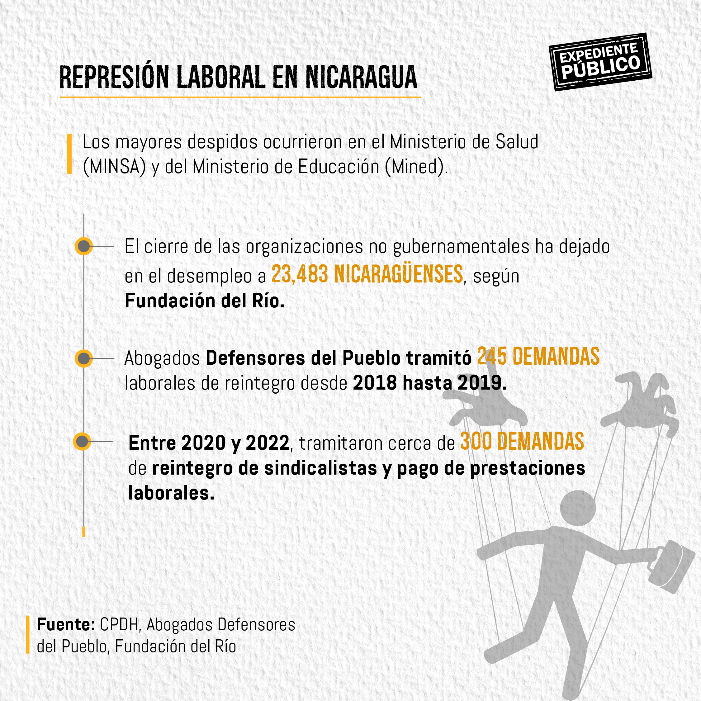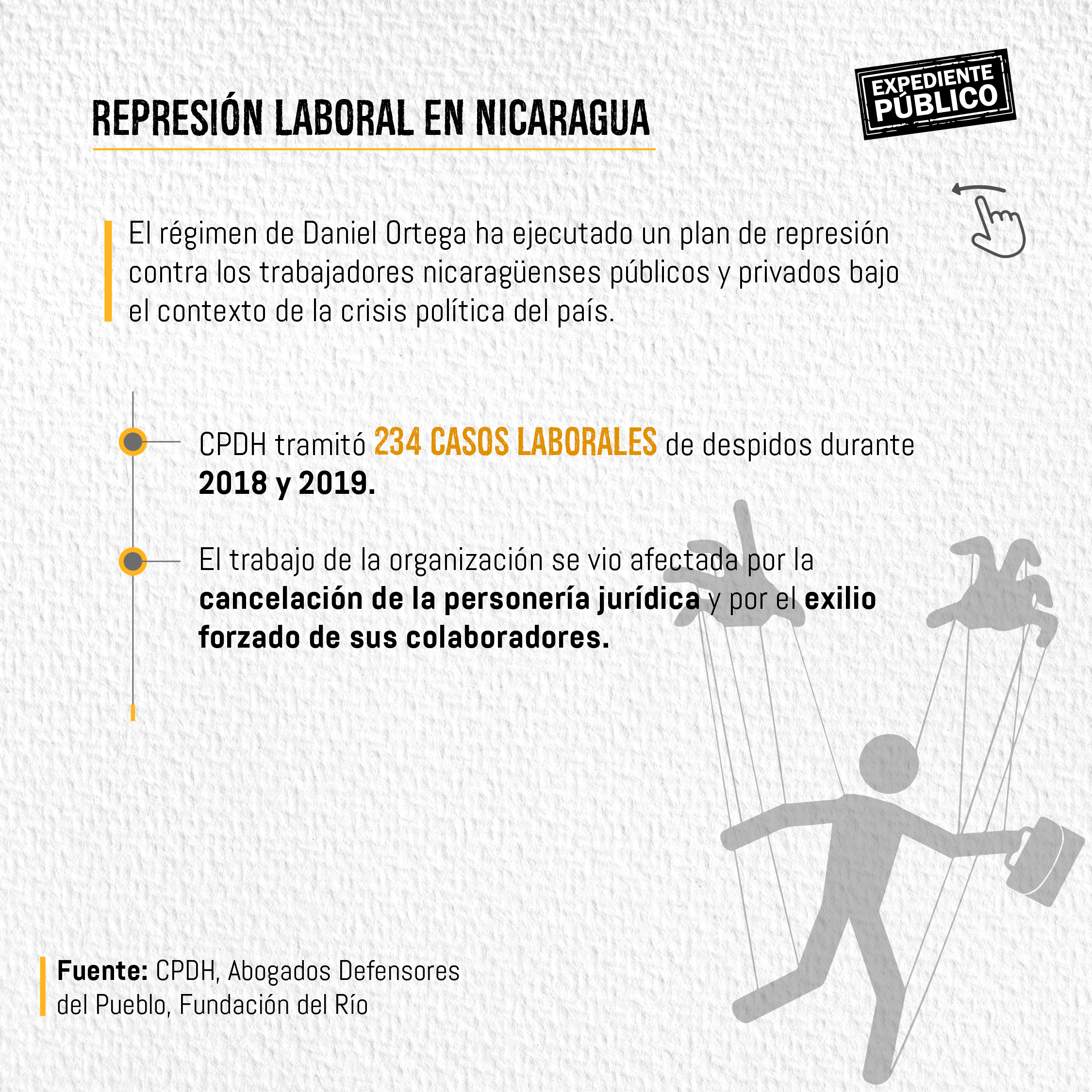 Por su parte, el abogado López refiere que junto a la CPDH tramitaron durante 2018 y 2019, 234 casos de despidos de trabajadores del Estado, incluyendo dirigentes sindicales, de los cuales prevalecen del Ministerio de Educación (Mined) y del Ministerio de Salud (Minsa). El trabajo de la organización se vio afectada por la cancelación de su personería jurídica y el exilio forzado de sus integrantes.