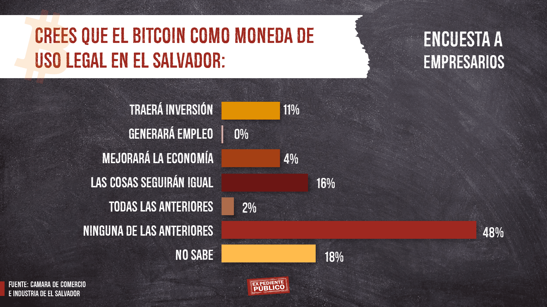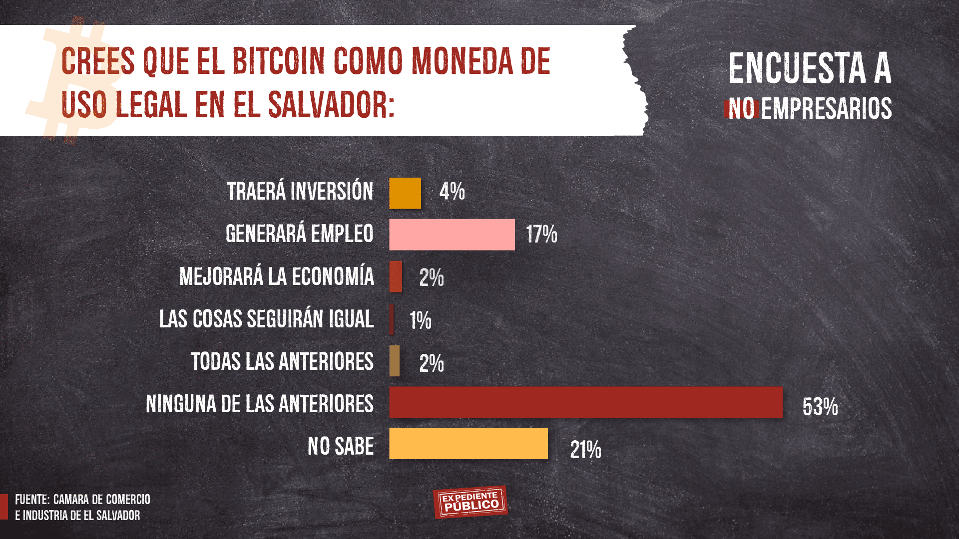 Una de las principales interrogantes fue si los ciudadanos estarían dispuestos a recibir el salario en bitcoin, a lo que el 93 % respondió que no y un 7 % dijo estar de acuerdo. Entre las razones que expusieron los encuestados para no recibir el salario con la criptomoneda está la volatilidad (40 %), desconfianza (17 %), desconocimiento (15 %) y preferencia por el dólar (12 %).