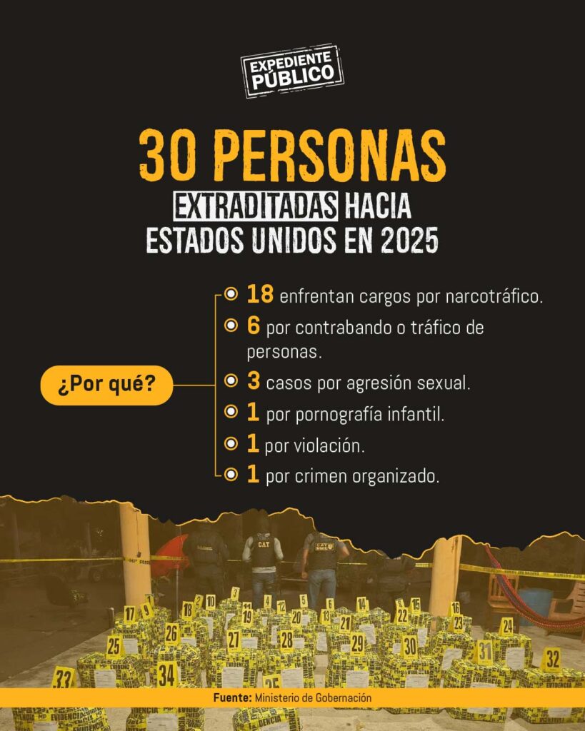 En materia de cooperación internacional, al menos 30 personas fueron extraditadas a Estados Unidos en 2025, la mayoría reclamadas por delitos relacionados con narcotráfico, conspiración para distribuir drogas y lavado de dinero.