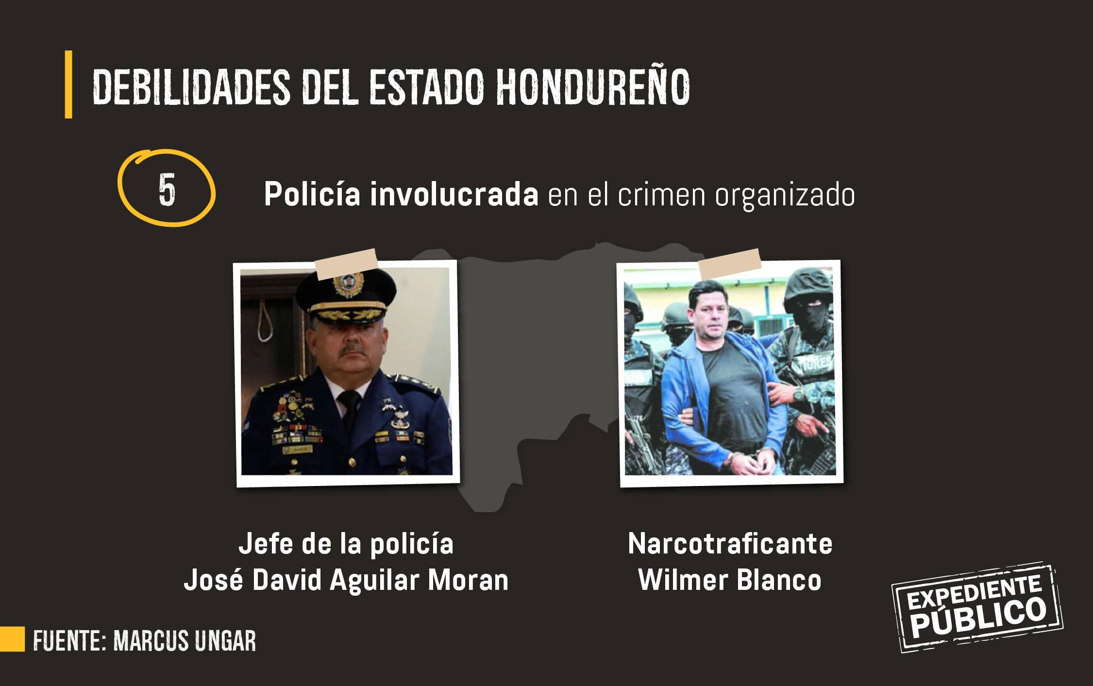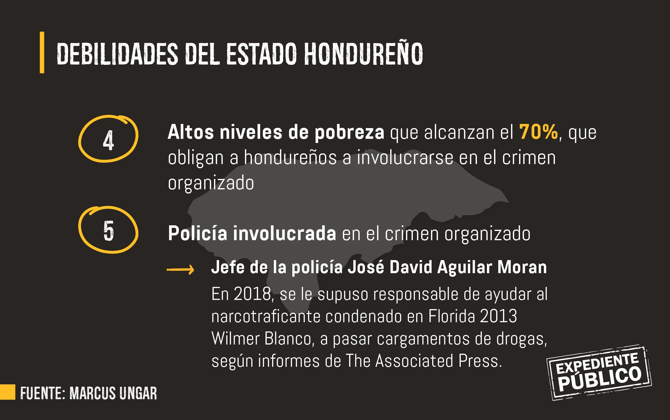Marcos Ungar, profesor de Ciencias Políticas y Justicia Criminal de la Universidad de la Ciudad de Nueva York, en declaraciones a Expediente Público confirmó “la intervención del crimen organizado en el sistema financiero de Honduras”. Según él, “muchas de las empresas, de hoteles, centros turísticos, lavado de automóviles, los dueños son maras y pandillas, crimen organizado. Entonces la economía depende de las inversiones y empresas controladas por maras y pandillas y crimen organizado”.