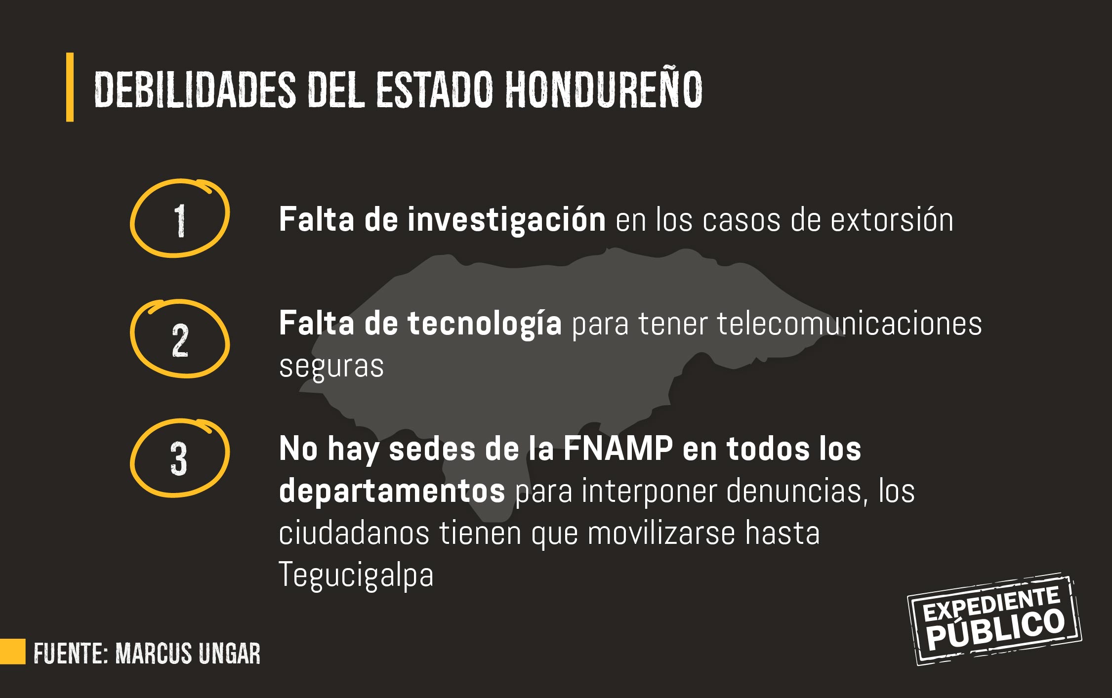 “Los expedientes investigativos no son completos y la prueba es muy débil. Normalmente las personas son detenidas por poco tiempo. Otra cosa es que estamos atacando solamente las personas que van a traer la extorsión, pero no atacamos a la estructura como tal”, argumentó Núñez.