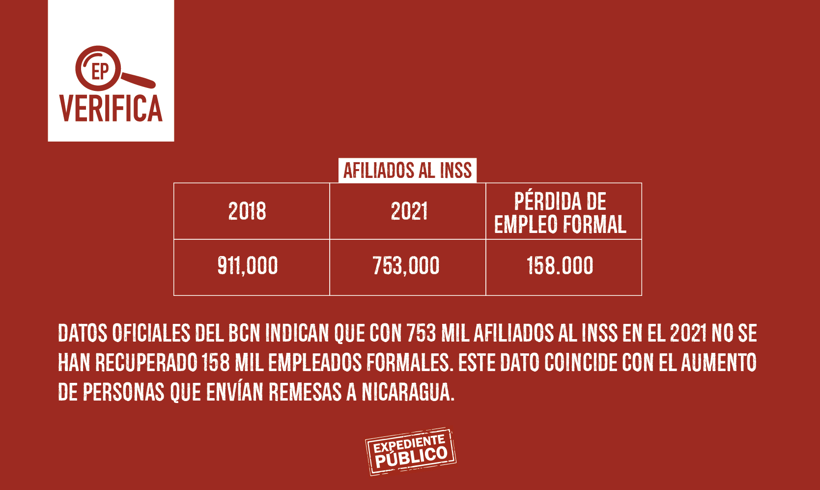 El gobierno tampoco ha generado empleo para los nicaragüenses. Datos oficiales del BCN indican que con 753 mil afiliados al INSS en el 2021 no se han recuperado 158 mil empleados formales. Este dato coincide con el aumento de personas que envían remesas a Nicaragua.