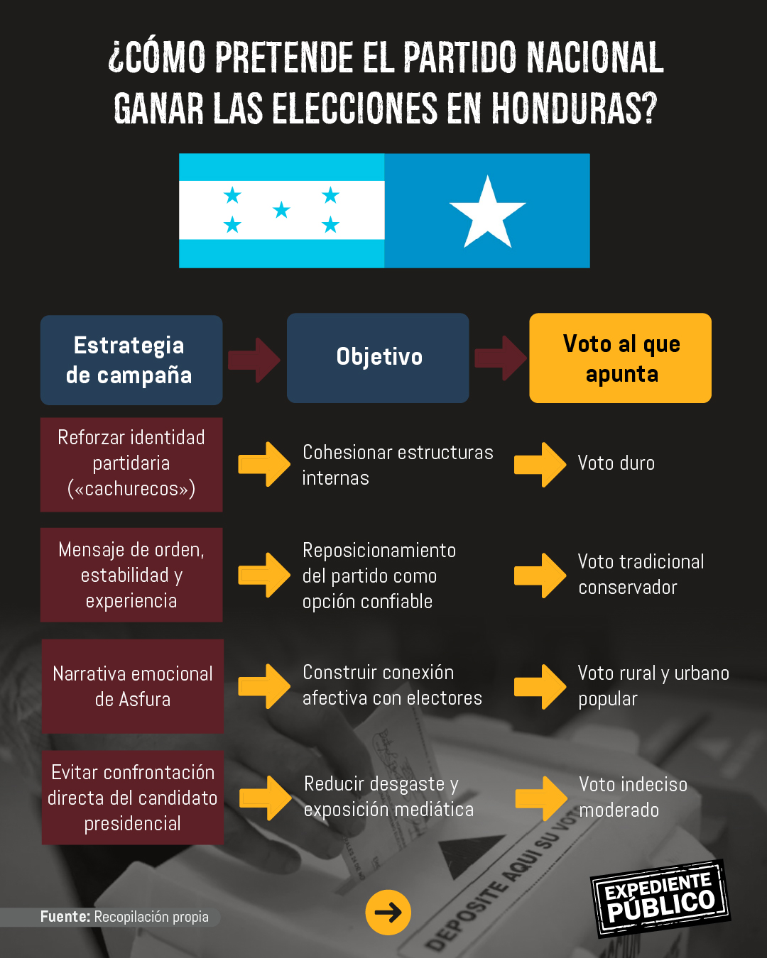 El objetivo principal del PN sería mantener preservar su poder territorial en el Congreso Nacional (en la actualidad tiene 44 de 128 legisladores) y en las alcaldías municipales (en las pasadas elecciones ganó 139 de 298).