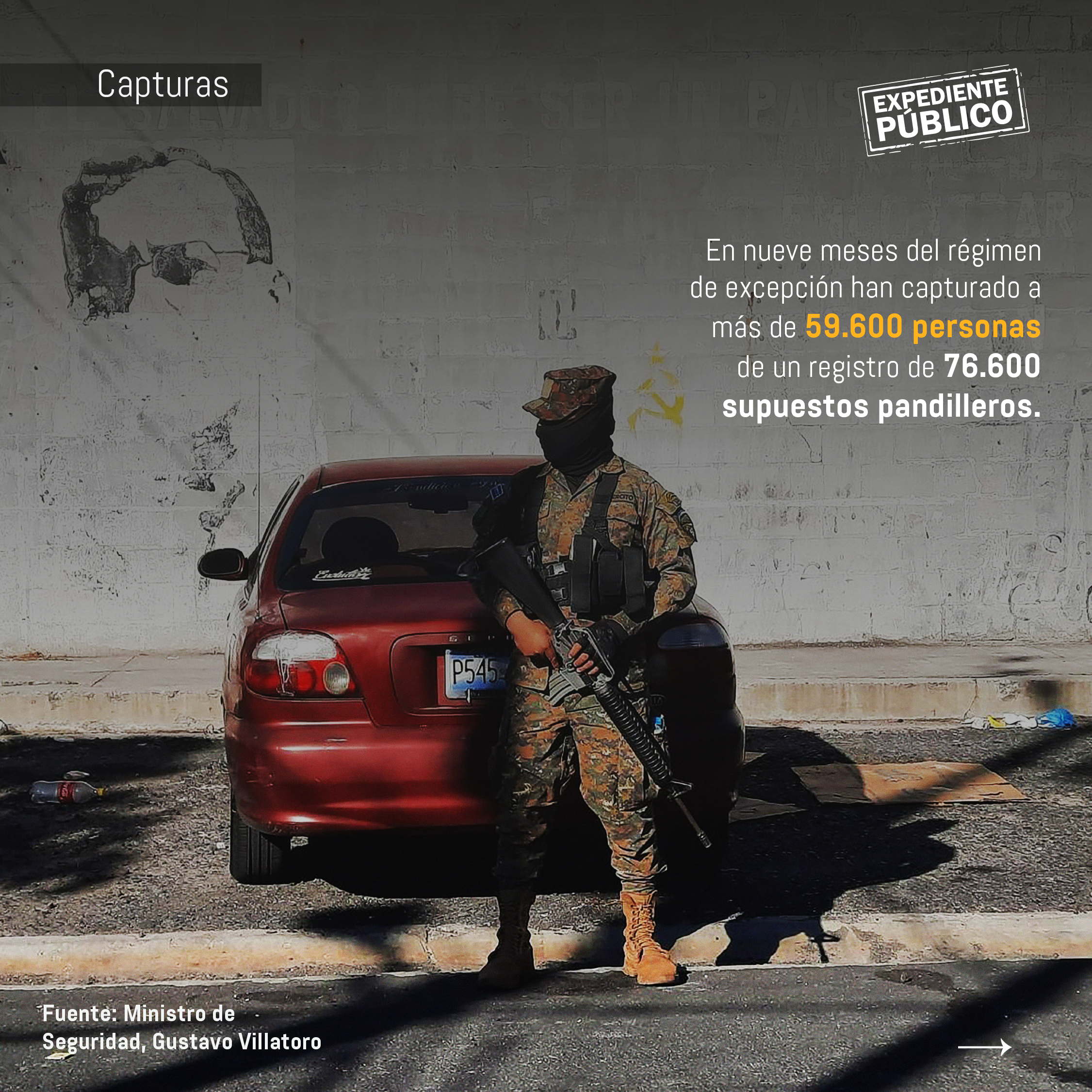 De acuerdo a las estadísticas del Ministerio de Justicia y Seguridad Pública, en nueve meses de vigencia del régimen de excepción se han capturado a más de 59,600 personas. Las autoridades contabilizan un registro de 76.600 pandilleros en todo el país.