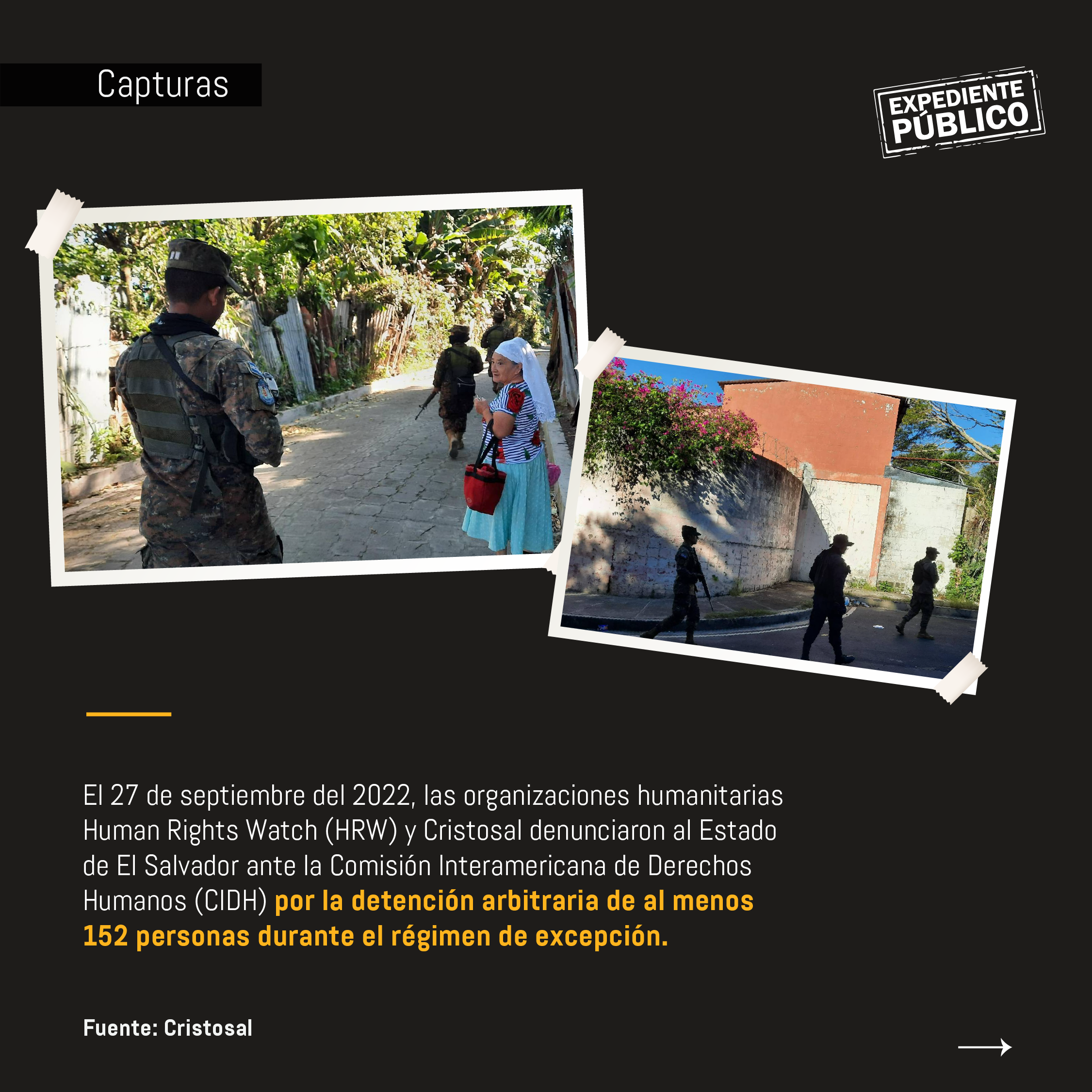 El 27 de septiembre las organizaciones Human Rights Watch (HRW) y Cristosal interpusieron una denuncia contra el Estado salvadoreño ante la Comisión Interamericana de Derechos Humanos (CIDH) por la detención arbitraria de al menos 152 personas durante el régimen de excepción.