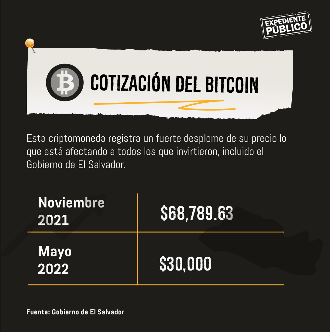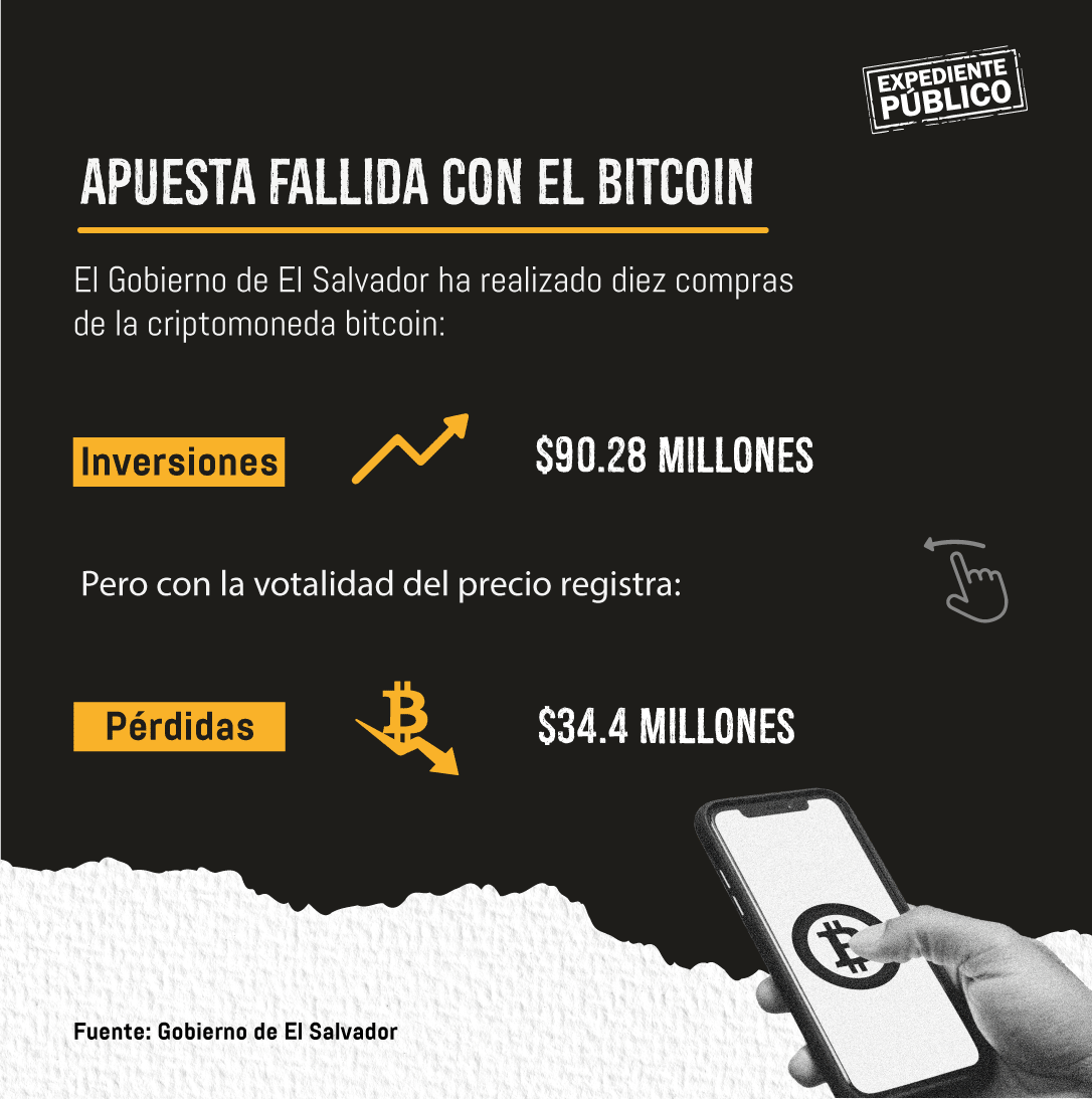 El Gobierno salvadoreño, con el presidente Bukele como principal entusiasta, ha realizado diez compras del criptoactivo. Las primeras nueve compras suman 1,801 bitcoins, que habían requerido una inversión de al menos $90.28 millones de fondos públicos. Pero con la volatilidad del bitcoin, El Salvador perdió en ellas más de $34.4 millones en sus bitcoins luego que el criptoactivo cayera a su nivel más bajo de los últimos 10 meses.