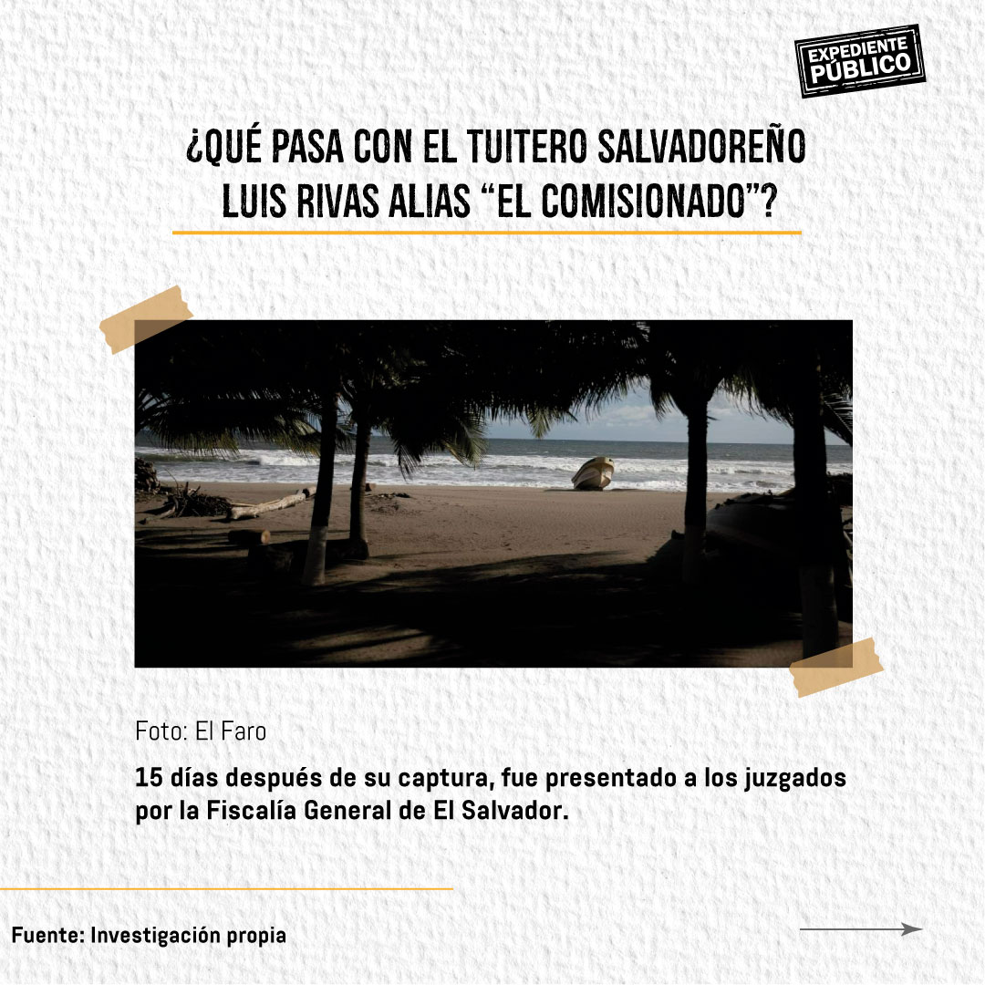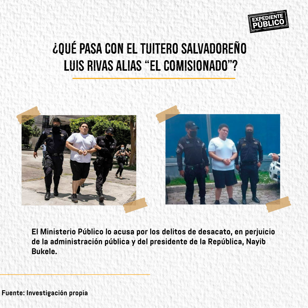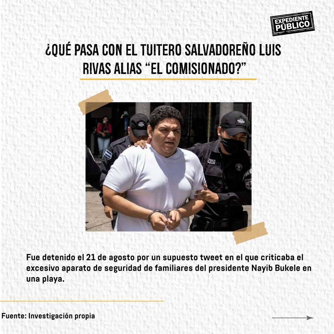 Rivas, conocido en Twitter como «El Comisionado», fue detenido el 21 de agosto, luego de publicar una fotografía de familiares de Bukele protegidos por guardaespaldas en una playa, con la que cuestionaba el excesivo sistema de seguridad. A la fecha no hay rastro digital del tuit, por lo que se desconoce si lo obligaron a borrarlo o lo quitó por decisión propia.