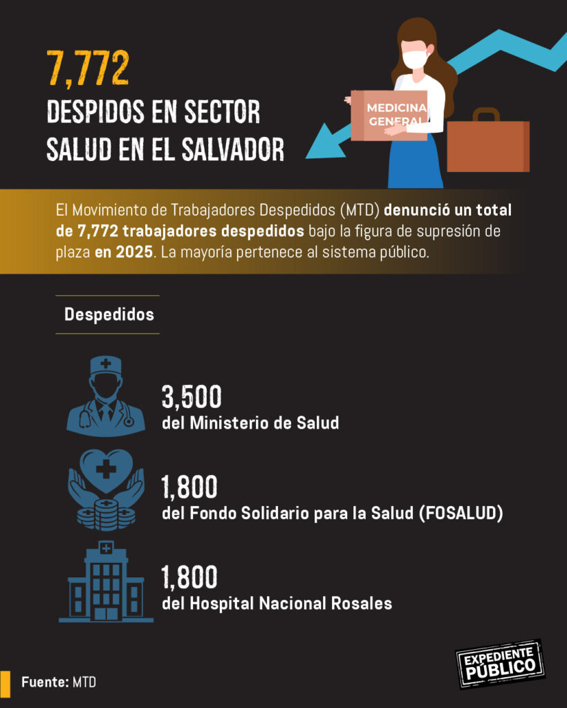 El Movimiento de Trabajadores Despedidos (MTD) denunció que la denominada “medicina amarga”, un concepto que acuñó Bukele en su discurso de posesión en 2019, cargó mayoritariamente contra el sector salud donde contabilizan 7,772 despedidos en todo 2025 bajo la figura de supresión de plazas.