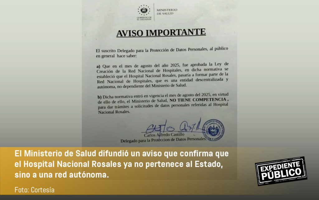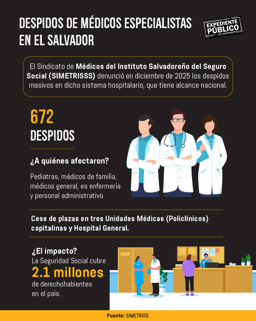 “Diciembre finalizó con una ola de despidos en distintas unidades médicas y hospitalarias del país, dentro de la red de la seguridad social (…) Estas medidas representan una amenaza directa al derecho a la salud de la población salvadoreña”, afirmó Aguirre a Expediente Público.