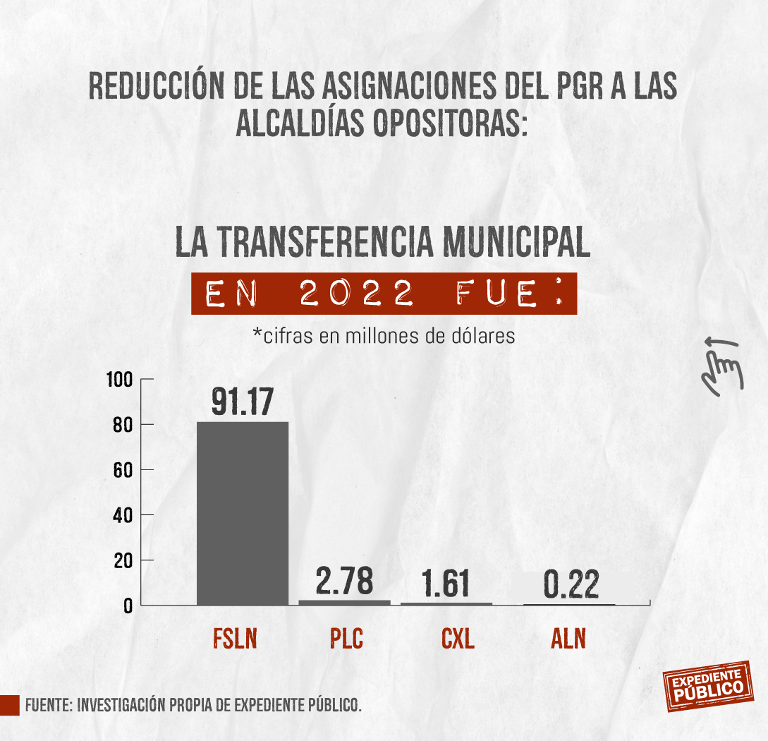 El cambio en la disminución de asignaciones opositoras no han sido muchos, salvo de las alcaldías de Wiwilí es un municipio del departamento de Nueva Segovia y San Pedro de Lóvago es un municipio del departamento de Chontales, cuyos alcaldes del PLC fueron despojados de sus funciones en el 2018 y en este 2022 se vio un aumento en sus asignaciones de un 61% y 22% respectivamente.