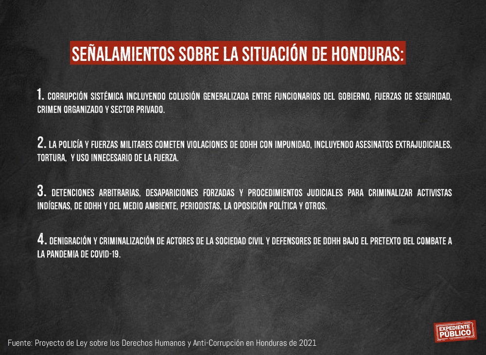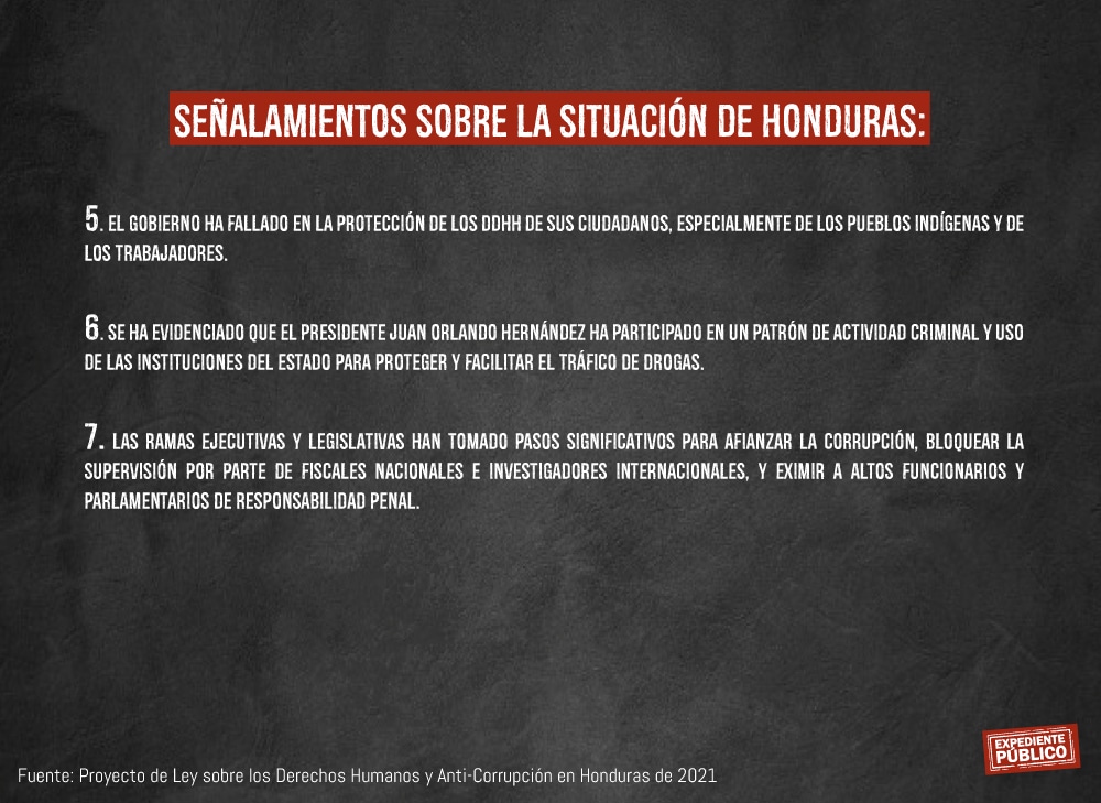 Añadió que “esta propuesta de ley señala particularmente al presidente Juan Orlando Hernández, pero refleja un malestar más amplio en el sentido de que los problemas de Honduras son serios y hay que señalar claramente que para Estados Unidos no es aceptable esta situación y que no debieran esperar a que Estados Unidos se olvide o voltee los ojos y no vea esta situación en Honduras”.