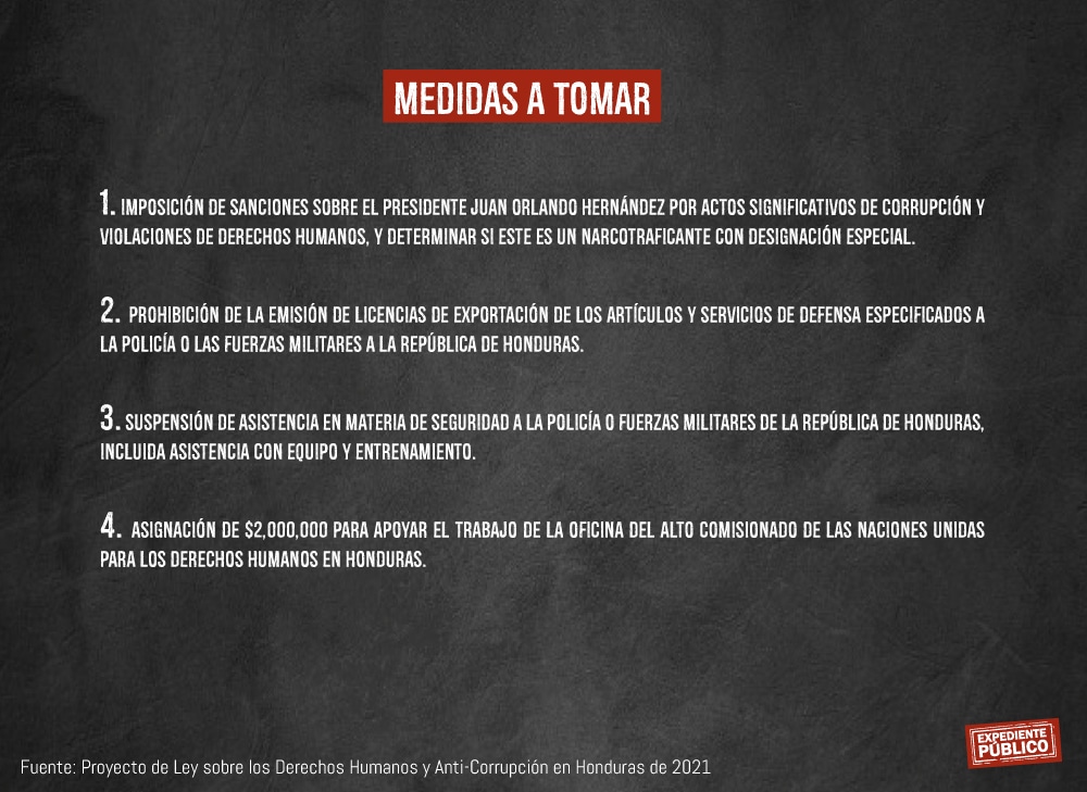 El martes 23 de febrero de 2021 el senador por Oregon, Jeff Merkley, presentó la iniciativa de ley que, de ser aprobada, obligaría al presidente Joe Biden a aplicar una serie de sanciones, desde retirar la visa y congelar los activos del presidente hondureño Juan Orlando Hernández, hasta suspender cualquier tipo de apoyo a las fuerzas militares y policiales por sus implicaciones en violaciones a Derechos Humanos.
