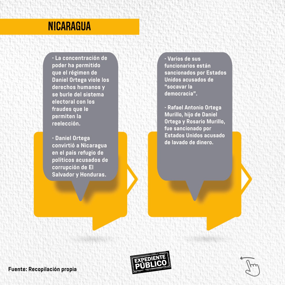 Honduras (5.36) y El Salvador (5.9) han pasado de una democracia defectuosa, a un régimen híbrido, o sea una combinación de elementos democráticos y autoritarios; y Nicaragua fue calificado como un país con “régimen autoritario” obteniendo una calificación de 3.6.