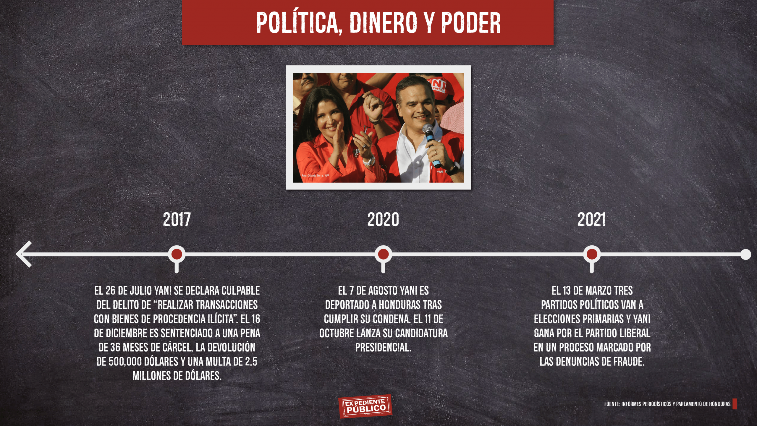 Yani cumplió su pena en agosto de 2020 y de inmediato fue deportado a Honduras, donde en una larga entrevista en una televisora propiedad de su familia aseguró que se había declarado culpable de un delito en Estados Unidos que no es delito en Honduras (“tranzar con bienes de origen ilícito”), que había sido por “comprar algunas vacas” al cartel de Los Cachiros, y se mostró arrepentido de lo sucedido. A los pocos días lanzó su precandidatura presidencial.