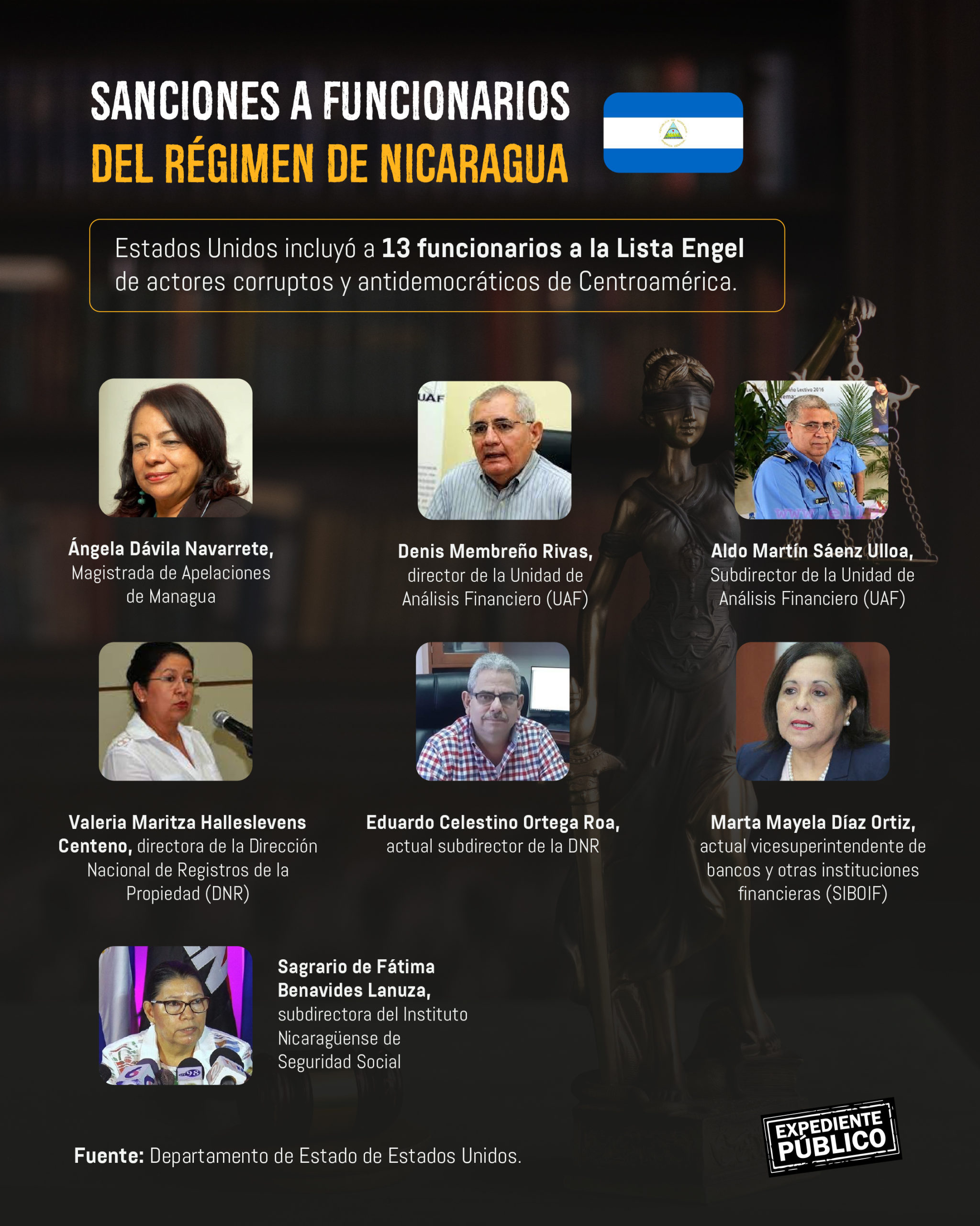 También fue designada Marta Díaz, vicesuperintendente de Bancos de Nicaragua «por proporcionar información financiera» de opositores, y Sagrario Benavides, subdirectora del Instituto Nicaragüense de Seguridad Social (INSS) por actuar políticamente para «cancelar y confiscar las pensiones de los adversarios políticos sin una base legal».
