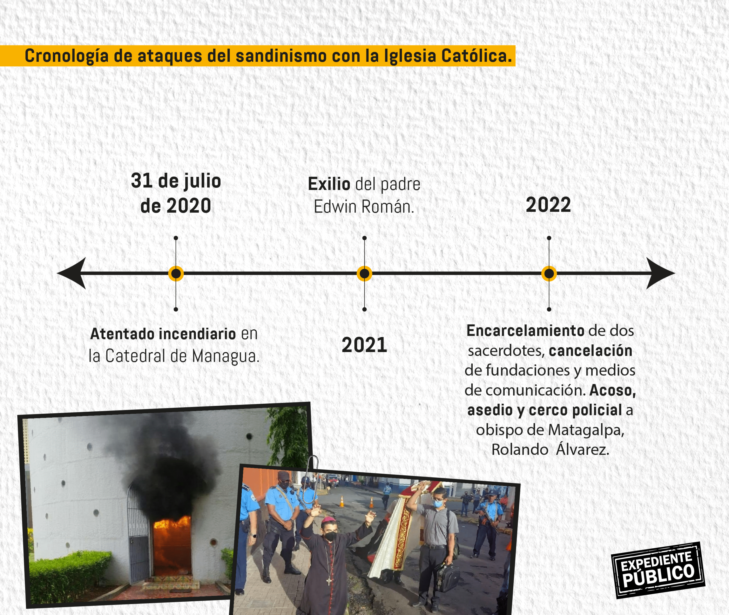 Además de estos ataques, hace una semana se conmemoró el segundo aniversario del atentado incendiario en la Catedral de Managua, y desde el 2018 se cerraron organizaciones caritativas, incluyendo Caritas y la Fundación de las Misioneras de la Caridad de Santa Teresa de Calcuta; mientras que el obispo auxiliar de Managua, Silvio Báez, fue prácticamente expatriado, así como el sacerdote de Masaya, Edwin Román.