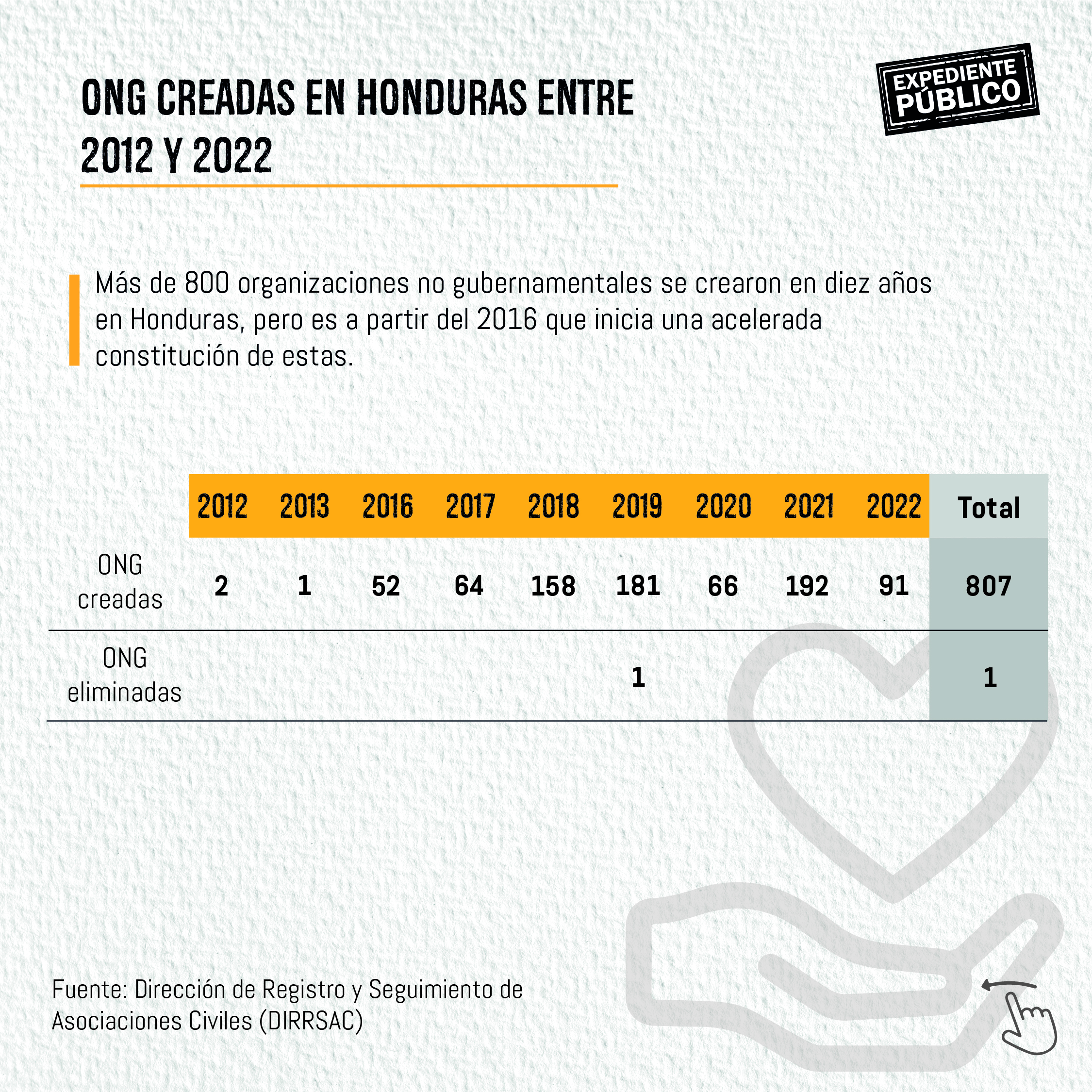 El jefe de la Uferco dijo que el inicio de esta práctica se remonta a los años 2010-2012, cuando en el gobierno de Porfirio Lobo (también del Partido Nacional) se hizo un inventario de las ONG’s “y se decía que iban a eliminar o que iban a cancelar la personería jurídica” a las que no estaban funcionando.