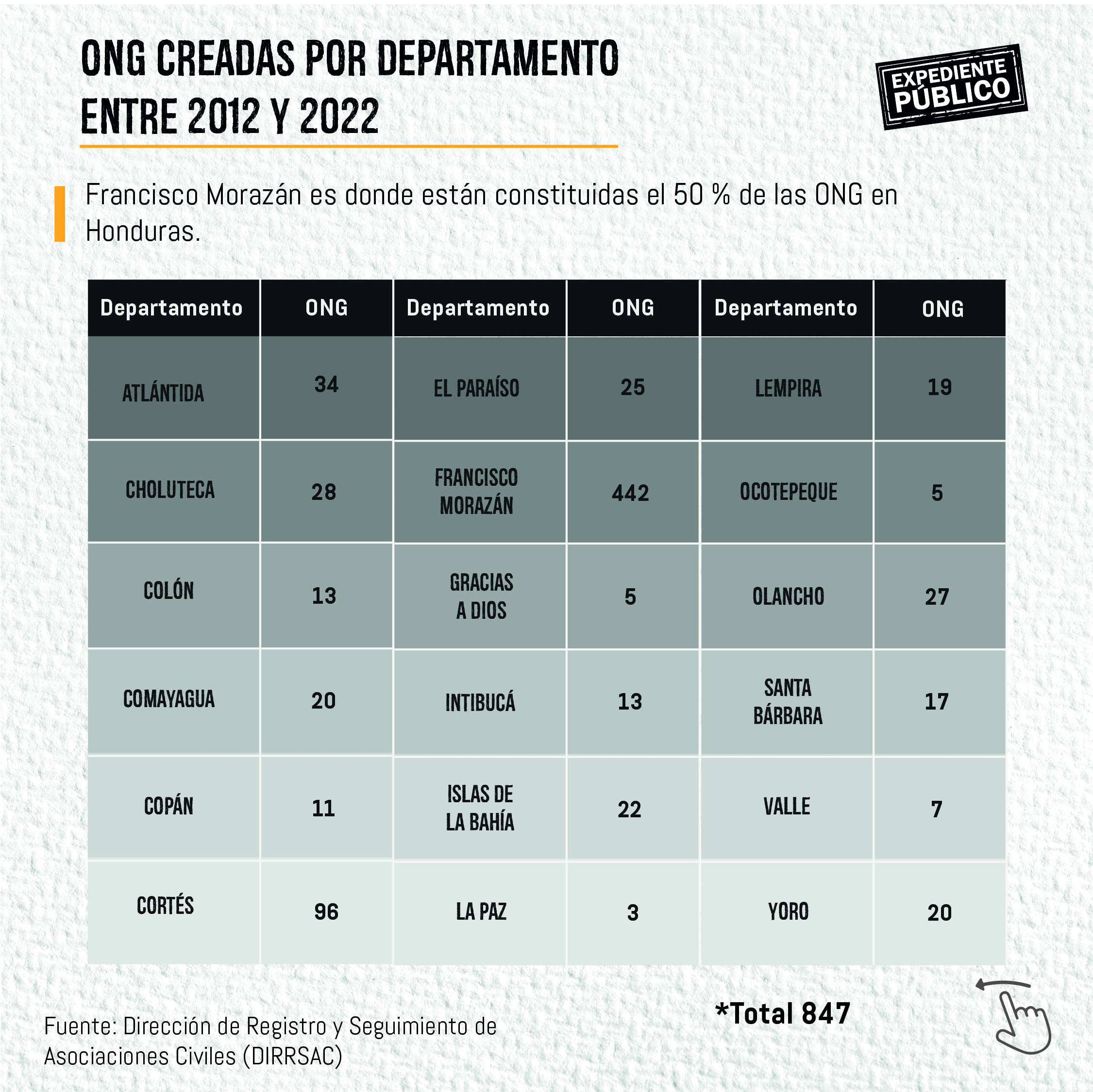 Actualmente, en la página de la Dirección de Registro y Seguimiento de Asociaciones Civiles (DIRRSAC) aparecen 16,981 asociaciones civiles, pero como ONG solo están registradas 823.