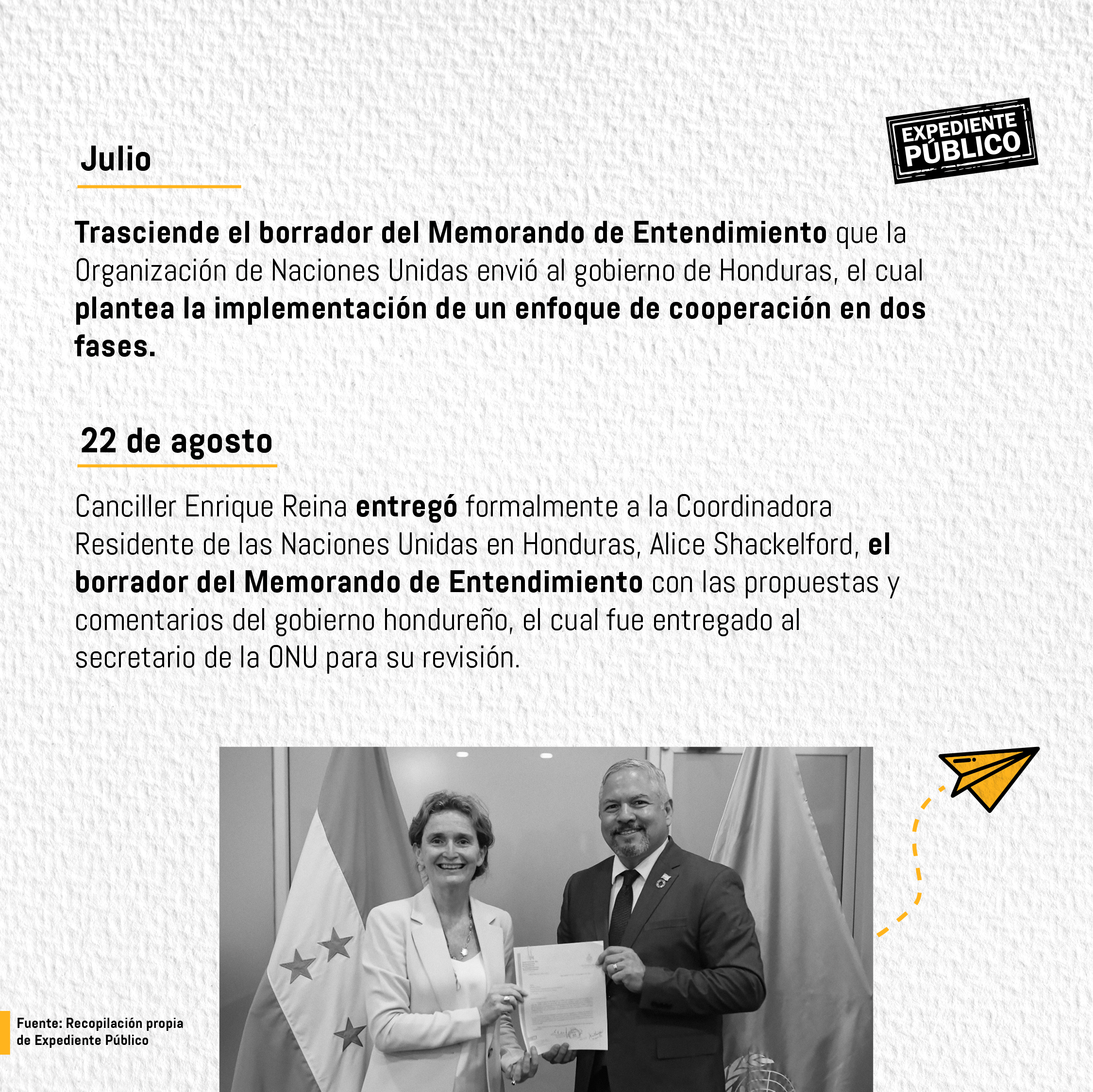 El pasado 22 de agosto, el gobierno hondureño entregó formalmente a la Coordinadora Residente de las Naciones Unidas en Honduras, Alice Shackelford, el borrador del Memorando de Entendimiento para la instalación de una Comisión Internacional Contra la Corrupción y la Impunidad en Honduras (CICIH), con los comentarios y propuestas al documento original enviado por el organismo internacional y cuyo contenido trascendió de forma extraoficial en julio de este año.