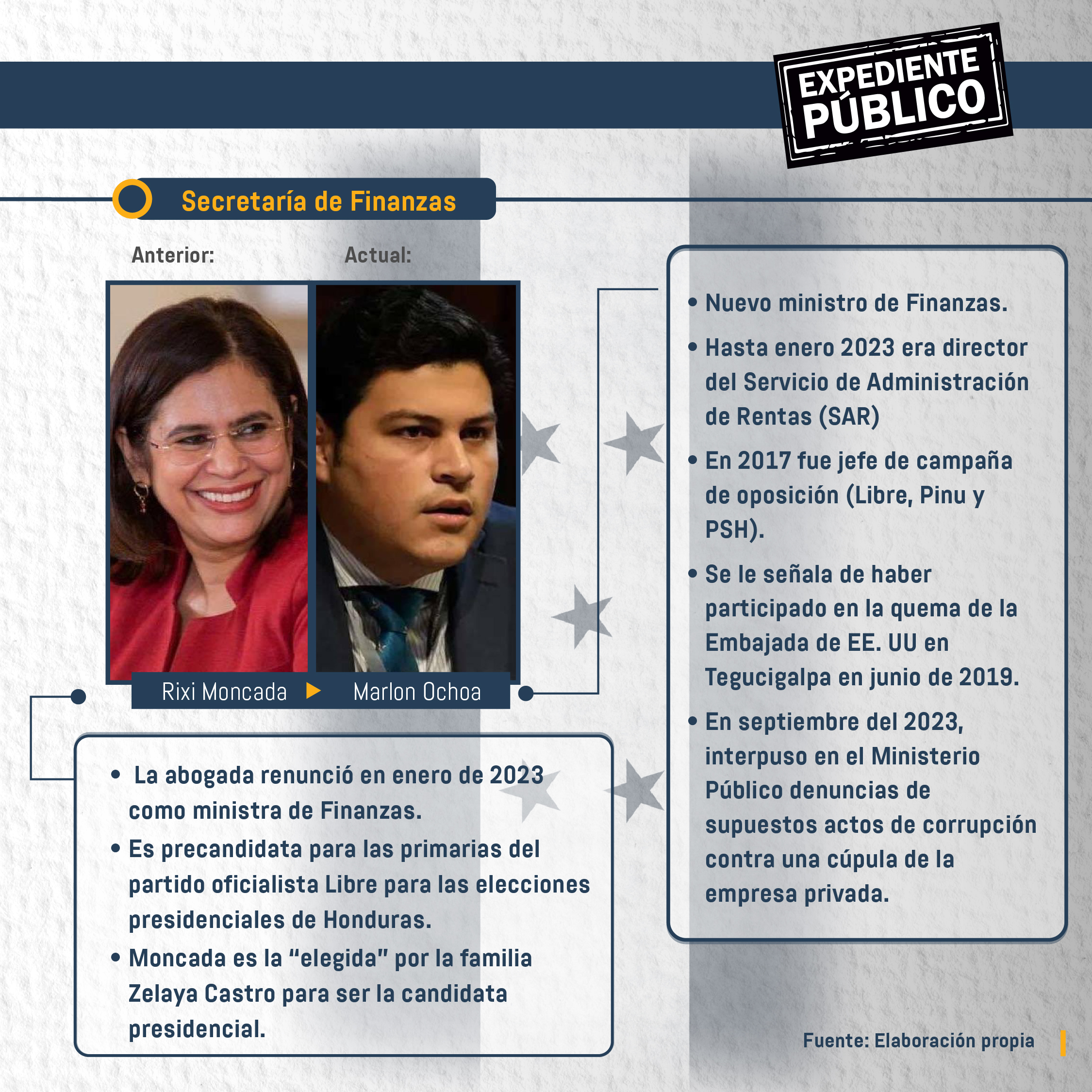 Antes del anuncio de cambios en el gabinete hondureño, la titular de la Secretaría de Finanzas, Rixi Moncada, presentó públicamente su renuncia para así poder postularse como candidata a la presidencia de Honduras por el movimiento 28 de junio del partido Libre.
