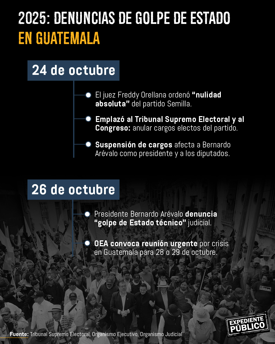 En cadena nacional, la noche del domingo 26 de octubre, Arévalo calificó las acciones judiciales como un “golpe desde los tribunales” y aseguró que existe un plan para desmantelar la democracia guatemalteca desde adentro.