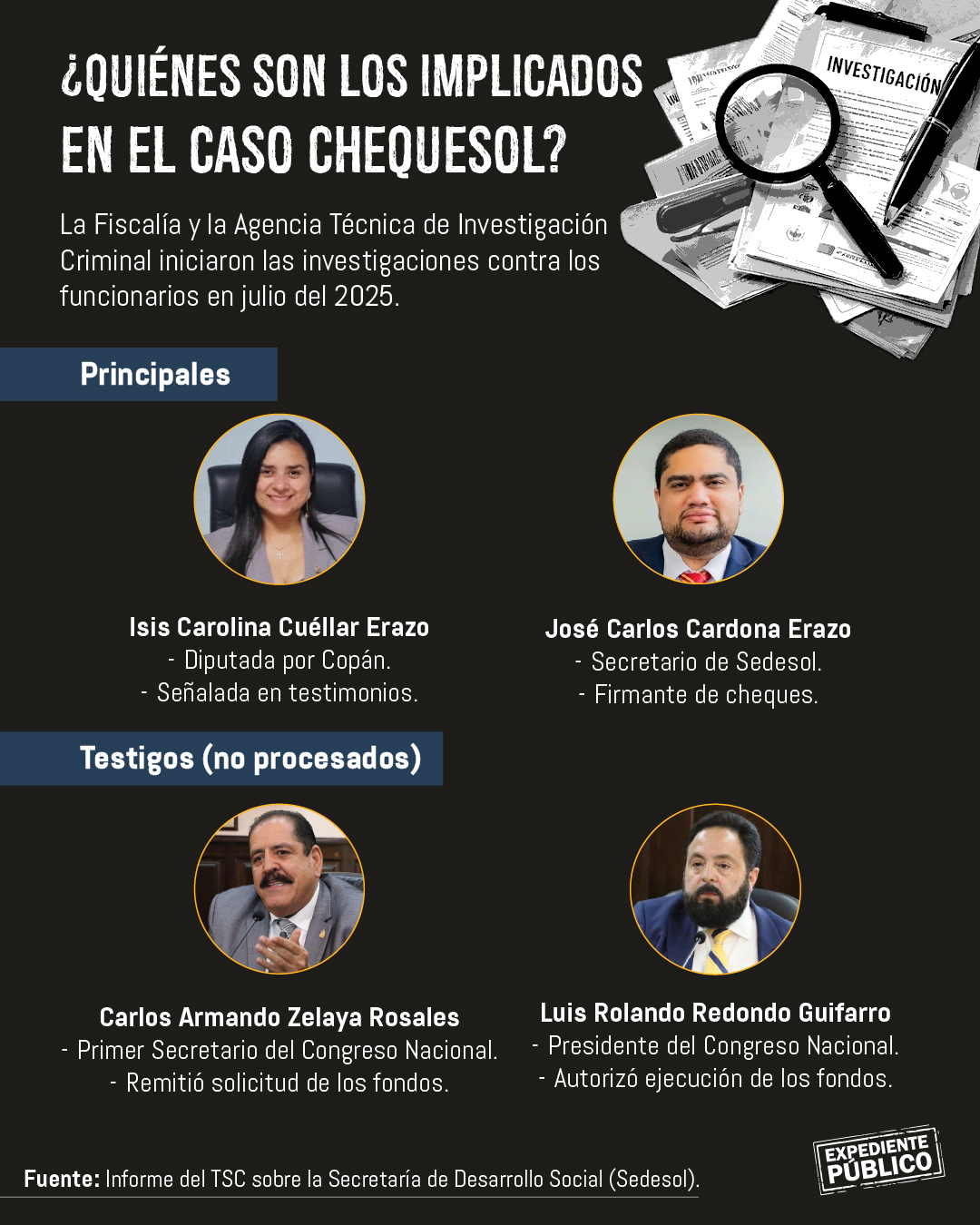 De estos, Cuéllar y Cardona forman parte de los doce procesados en el caso Chequesol, mientras que Redondo y Zelaya han sido llamados a declarar dentro del juico en calidad de testigos.