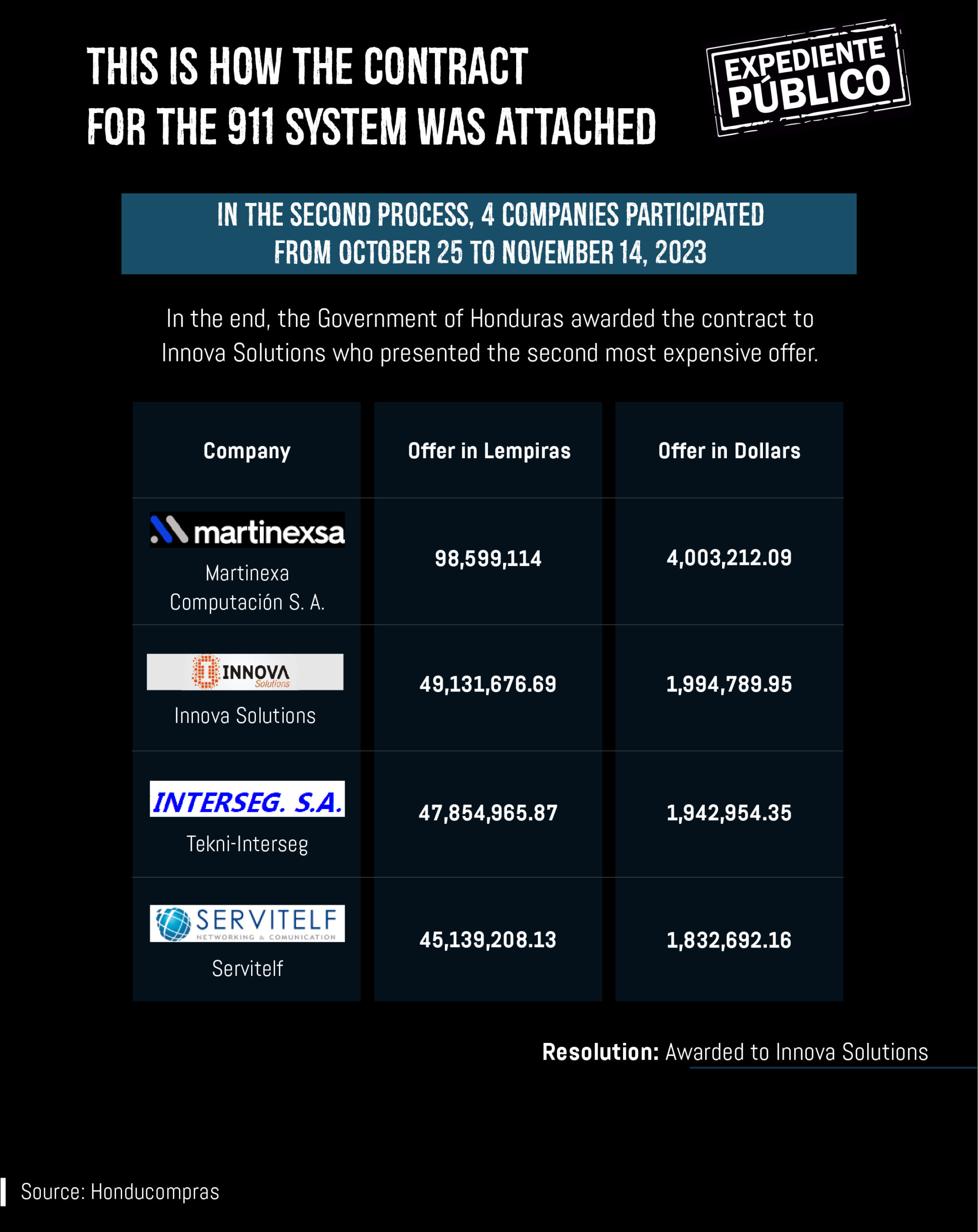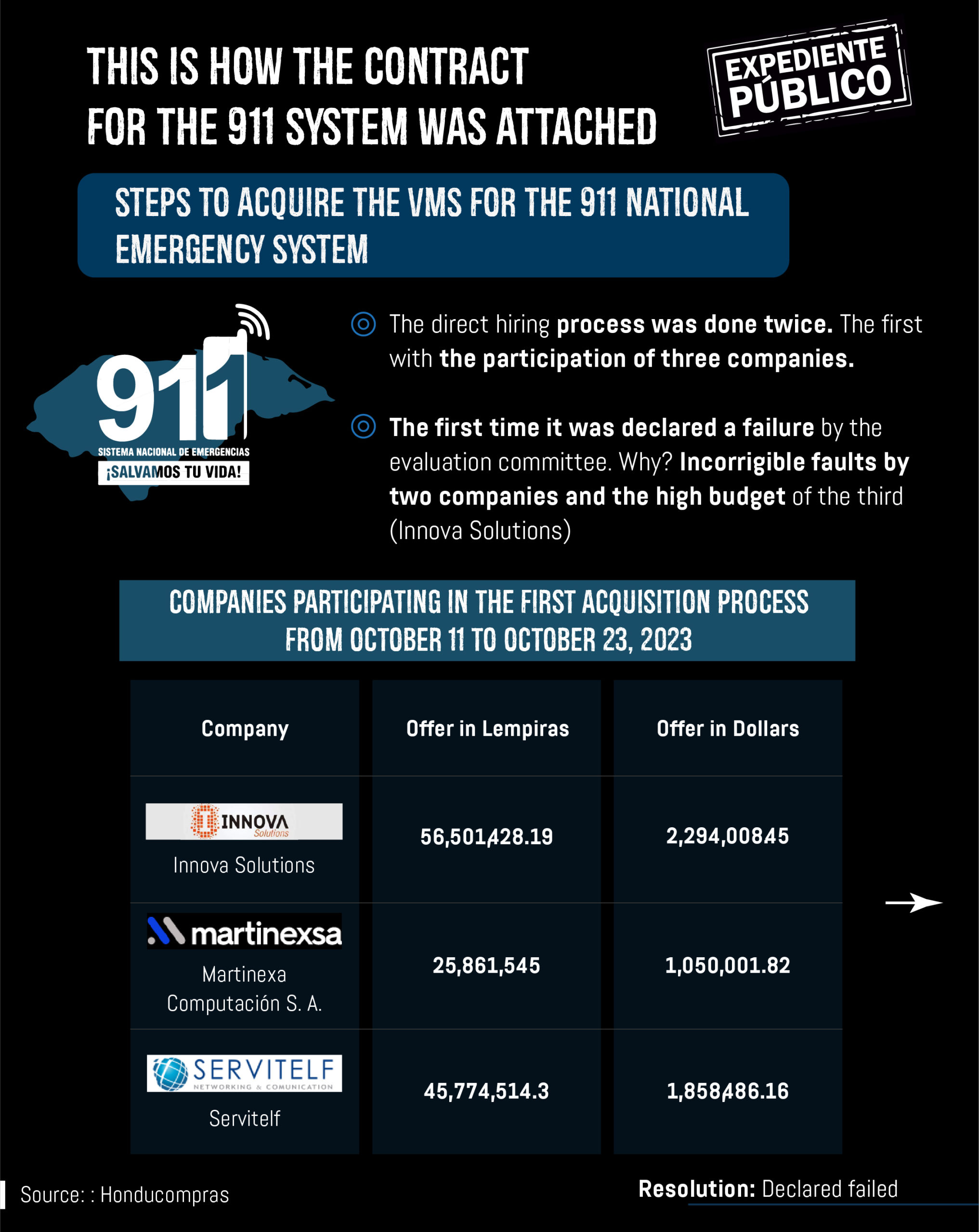 On that occasion, the company Innova Solutions bid 56,501,428.19 million lempiras (about $2.3 million), an amount that was not only the highest of the three participating companies, but rather it exceeded the estimated budget of 911, according to the declaration that resolved to leave the process unsuccessful.