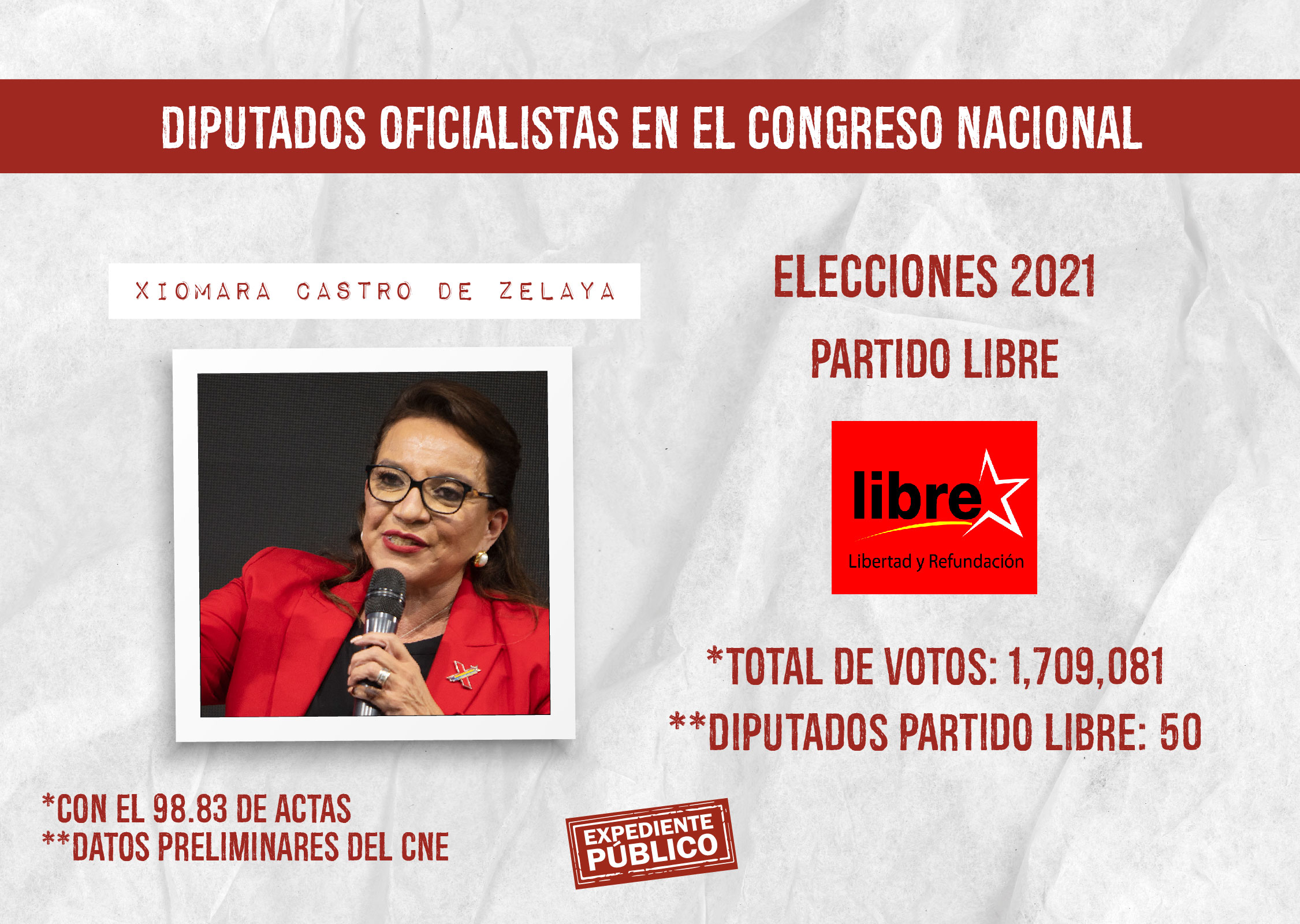 *Con más de 1.7 millones de votos, Xiomara Castro se convierte en la presidenta más votada de la historia, pero su partido Libertad y Refundación no llega siquiera a igualar el número de diputados que tiene actualmente el oficialista Partido Nacional.