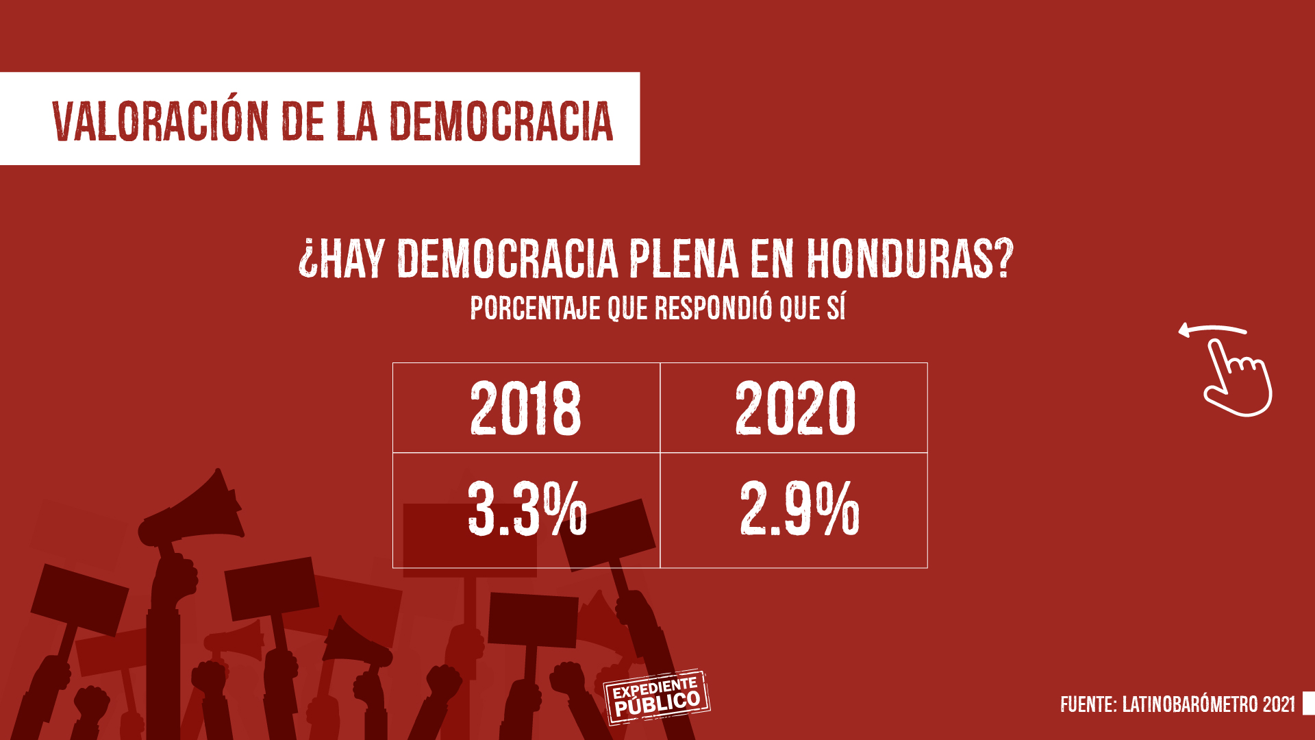 Otro de los hallazgos de la encuesta, realizada entre diciembre y octubre de 2020 en 18 países, entre ellos Honduras, Nicaragua y El Salvador, con un margen de error de 3%, es que apenas el 2.9% cree que hay democracia plena en Honduras, mientras que el 45 por ciento opina que este país “es una democracia con grandes problemas”.