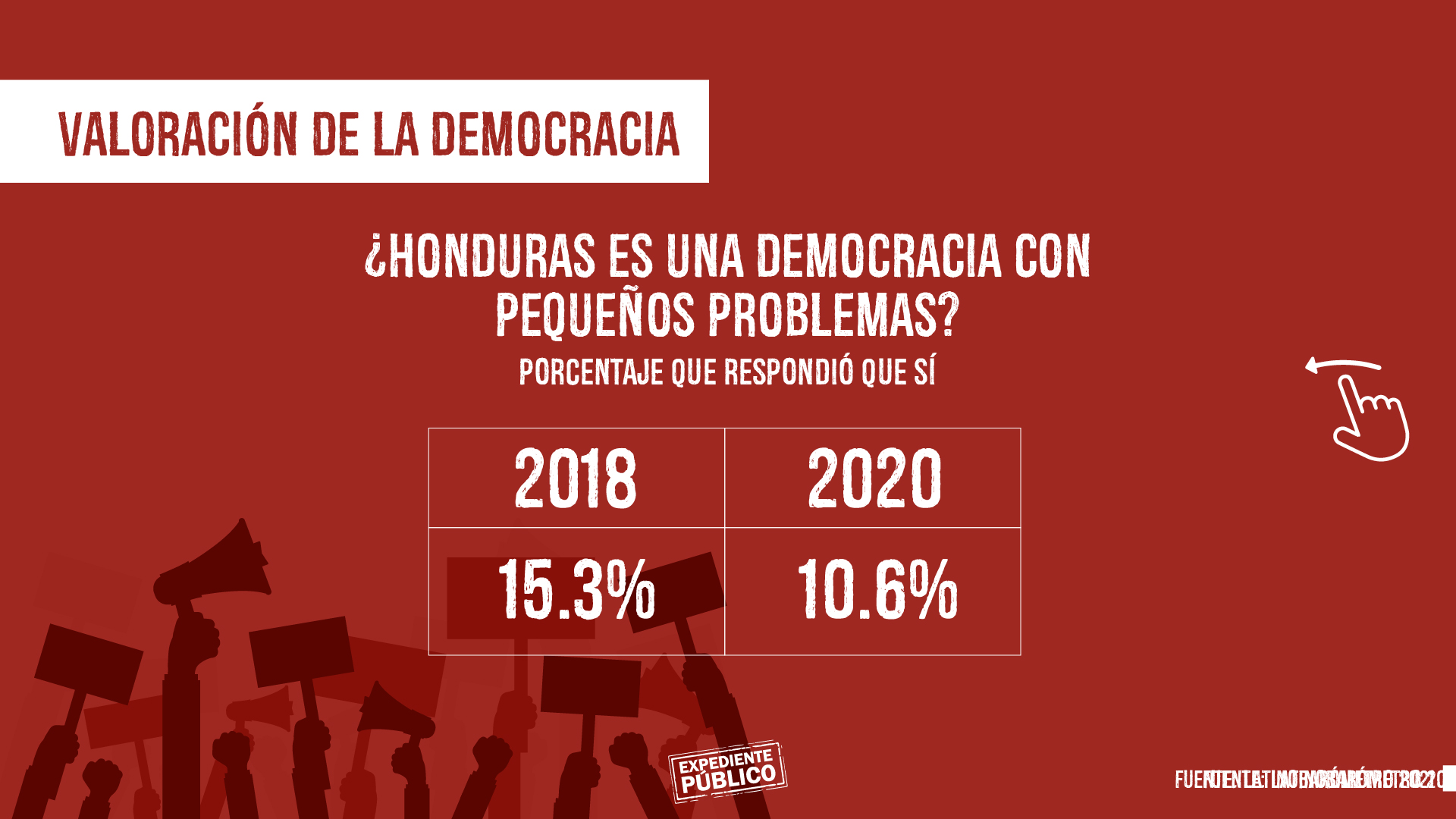 En 2020 la satisfacción hondureña con la democracia llegó a su punto más bajo con apenas un 15%, del que un 8.2% está “muy satisfecho” y un 6.8% “más bien satisfecho” con la democracia.
