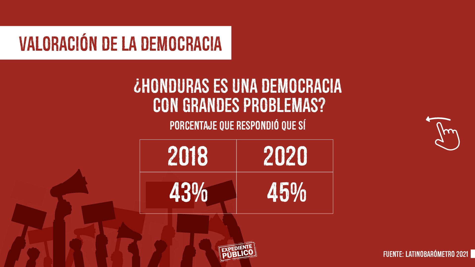 La satisfacción de la población de Honduras con su democracia ha tenido altibajos desde el golpe de Estado: pasando de 35% en 2010 a 29% en 2011, de 18% en 2013 a 34% en 2015 y de 29% en 2017 a 27% en 2018, según los datos del Latinobarómetro para cada uno de esos años».