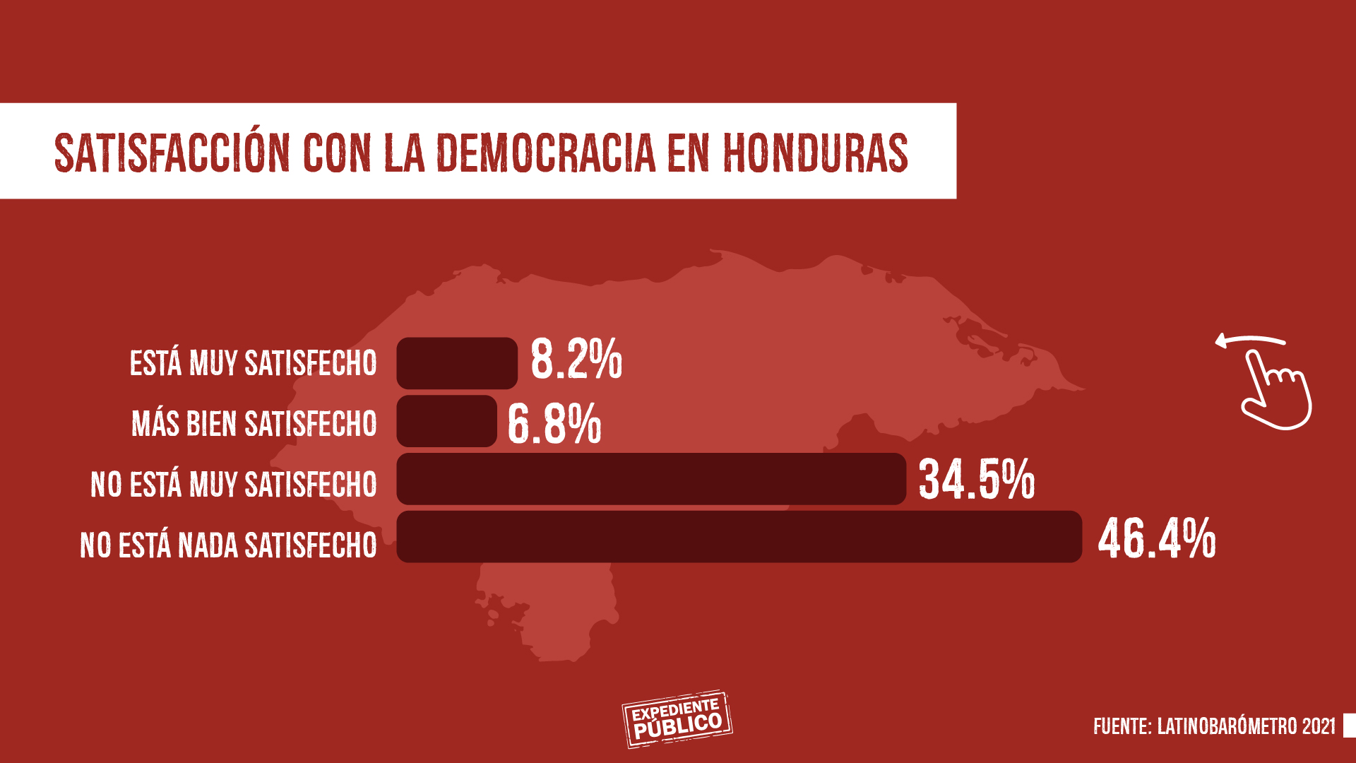 Visto del otro lado, “más del 80% de los hondureños está nada satisfecho o no muy satisfecho con su democracia”, señala un análisis del centro de investigación Expediente Abierto, según el cual la falta de institucionalidad, la inseguridad y las dificultades económicas “podrían haber impactado negativamente esta percepción”.