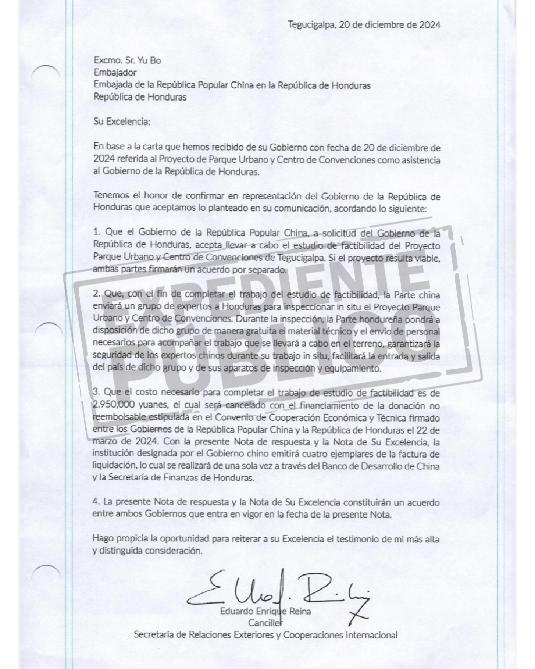 Aunque el Gobierno de Xiomara Castro dijo, en enero del 2025, que el proyecto sería financiado totalmente a través de donaciones de China, en las cartas firmadas por ambas partes no se describe esto.
