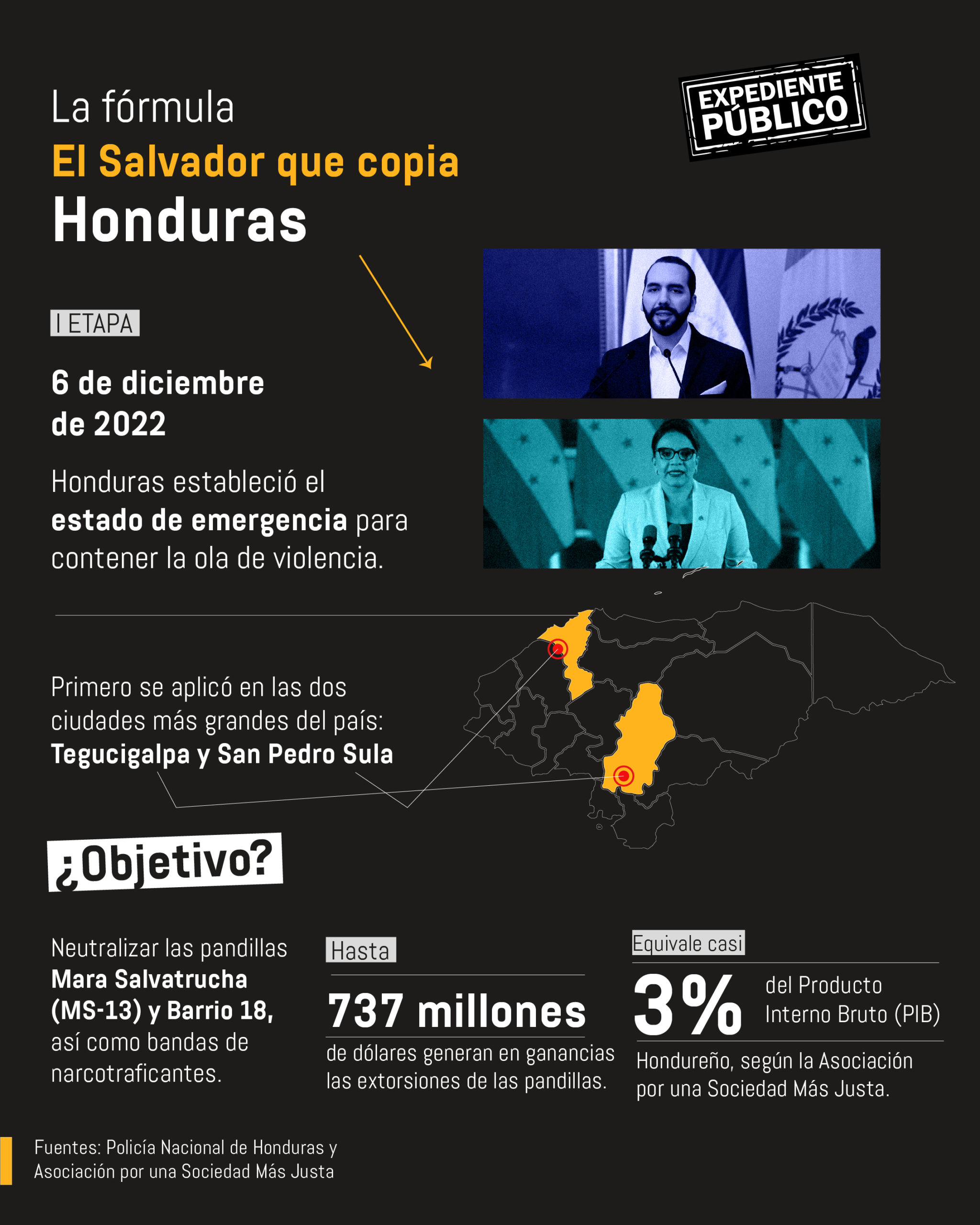 Resultados como la reducción de la criminalidad en El Salvador a partir de la decisión del presidente Nayib Bukele de recurrir al Estado de Excepción en el país fue lo que motivó a la presidenta de Honduras, Xiomara Castro, poner en marcha el 6 de diciembre del 2022 el régimen de emergencia en 162 barrios en las ciudades de San Pedro Sula y Tegucigalpa.