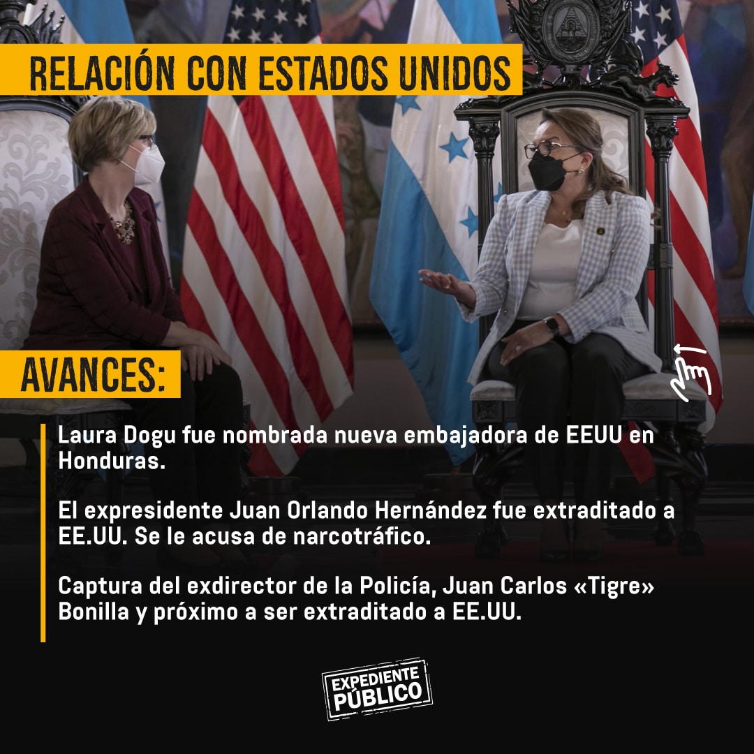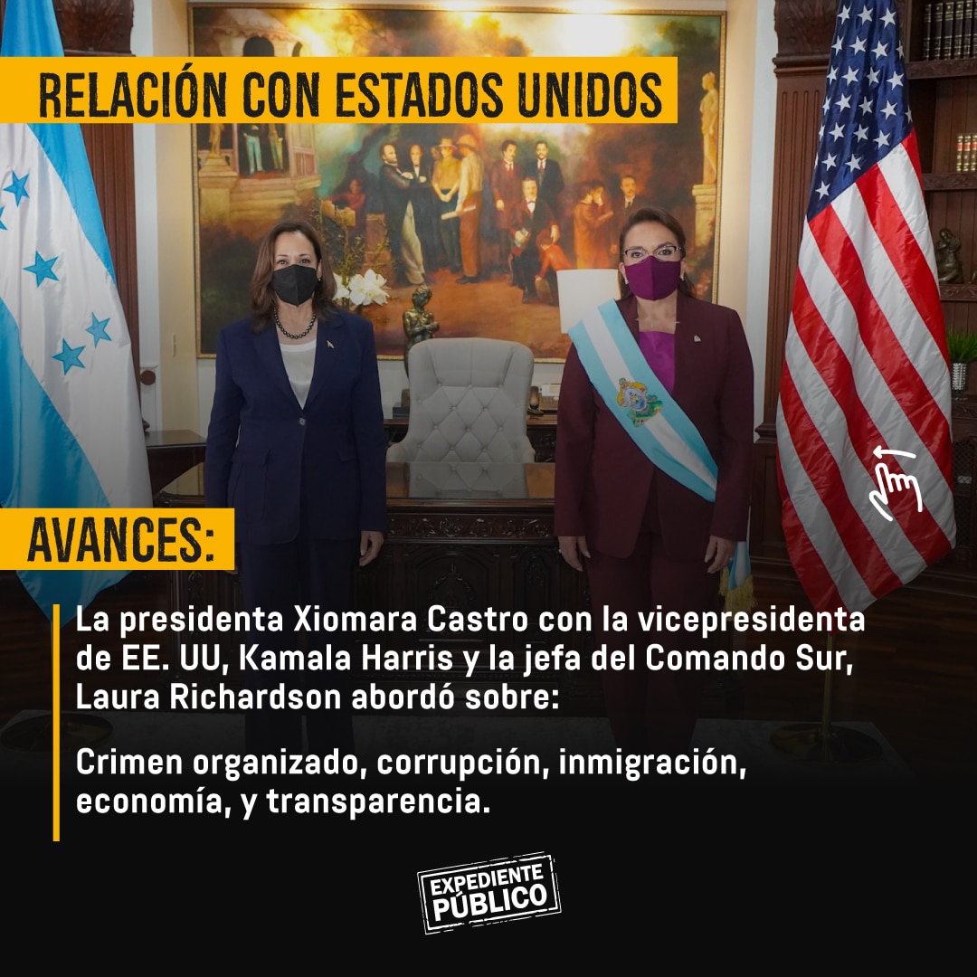 Junto al tema de la migración y la lucha contra el narcotráfico, el combate a la corrupción es la principal demanda que tiene el gobierno hondureño desde Estados Unidos. En sus primeros cien días, esta administración se reunió para dialogar al respecto con la vicepresidenta de Estados Unidos, Kamala Harris; con La Subsecretaria de la Oficina de Asuntos del Hemisferio Occidental en el Departamento de Estado de Estados Unidos, Emily Mendrala; con la jefa del Comando Sur, Laura Richardson; y con el secretario de Estado de los Estados Unidos, Anthony Blinken.