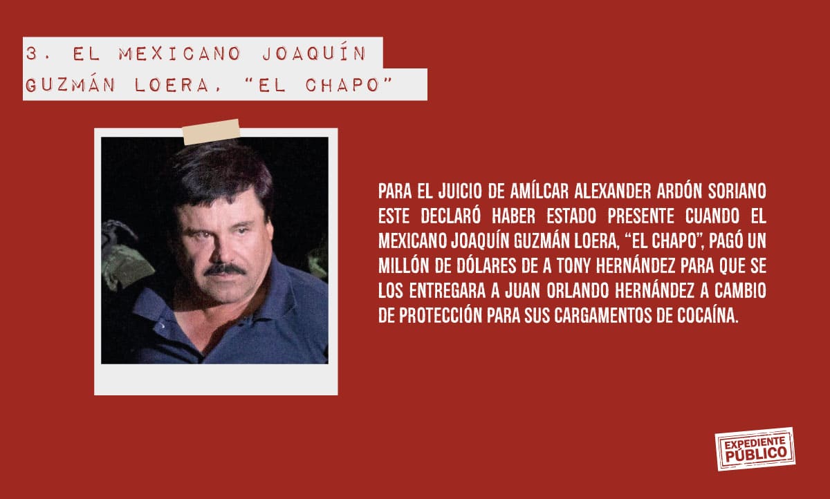 Para ese juicio varios narcotraficantes dieron información importante, uno de ellos fue Alexander Ardón, exalcalde de El Paraíso, Copán, ciudad localizada a 386 kilómetros al occidente de Tegucigalpa, quien dijo haber estado presente cuando el mexicano Joaquín Guzmán Loera, “El Chapo”, pagó un millón de dólares a Tony Hernández para que se los entregara a Juan Orlando Hernández a cambio de protección para sus cargamentos de cocaína.