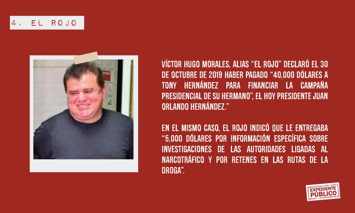 También Víctor Hugo Morales, alias “el Rojo” declaró el 30 de octubre de 2019 haber pagado “40,000 dólares a Tony Hernández para financiar la campaña presidencial de su hermano”, el hoy presidente Juan Orlando Hernández.