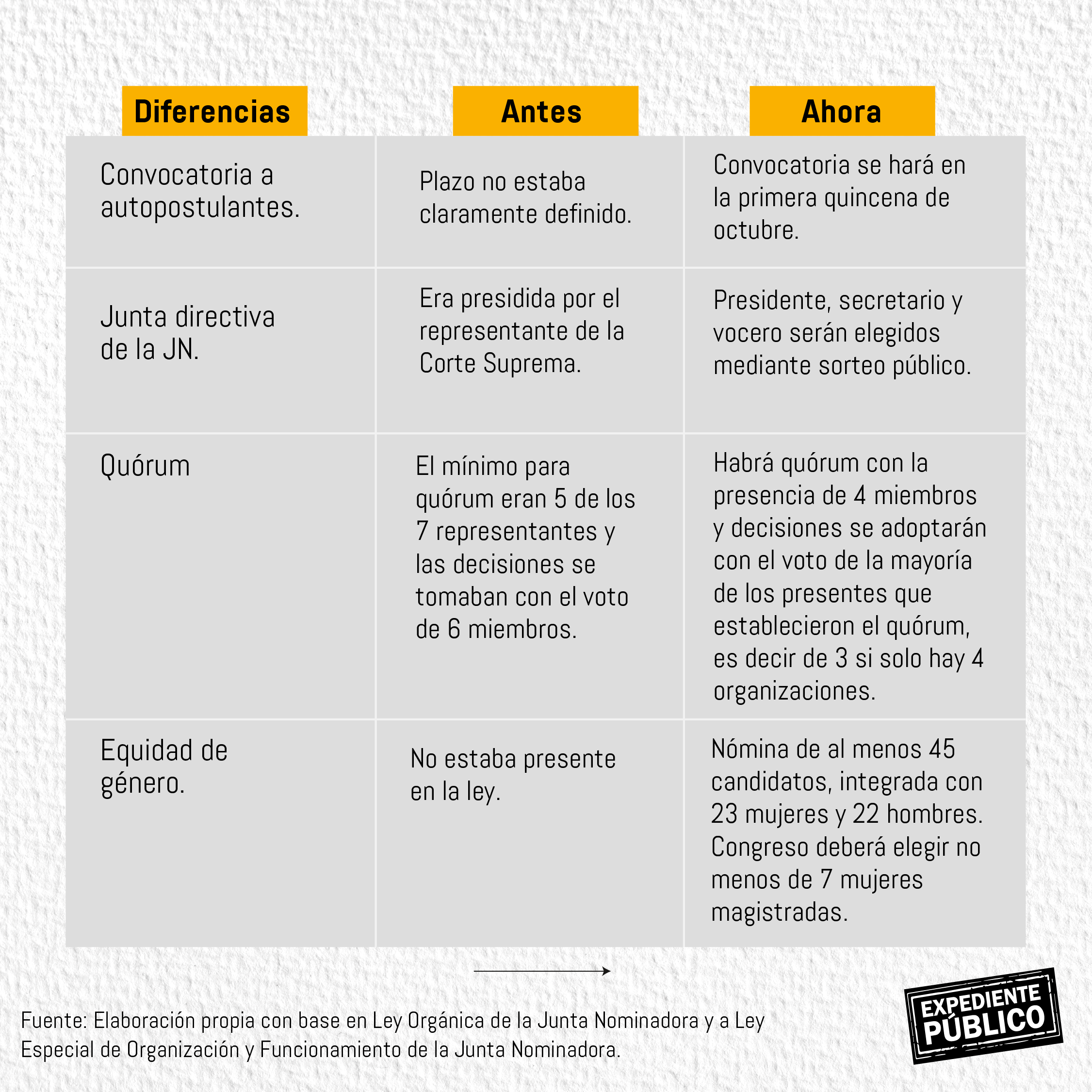 Aunque ambos elementos estarán bajo el margen de discrecionalidad de la JN, esta tendrá la obligación de justificar por qué incluyó o excluyó algunas candidaturas en la nómina de al menos 45 candidatos que deberá entregar al Legislativo el 23 de enero de 2023.