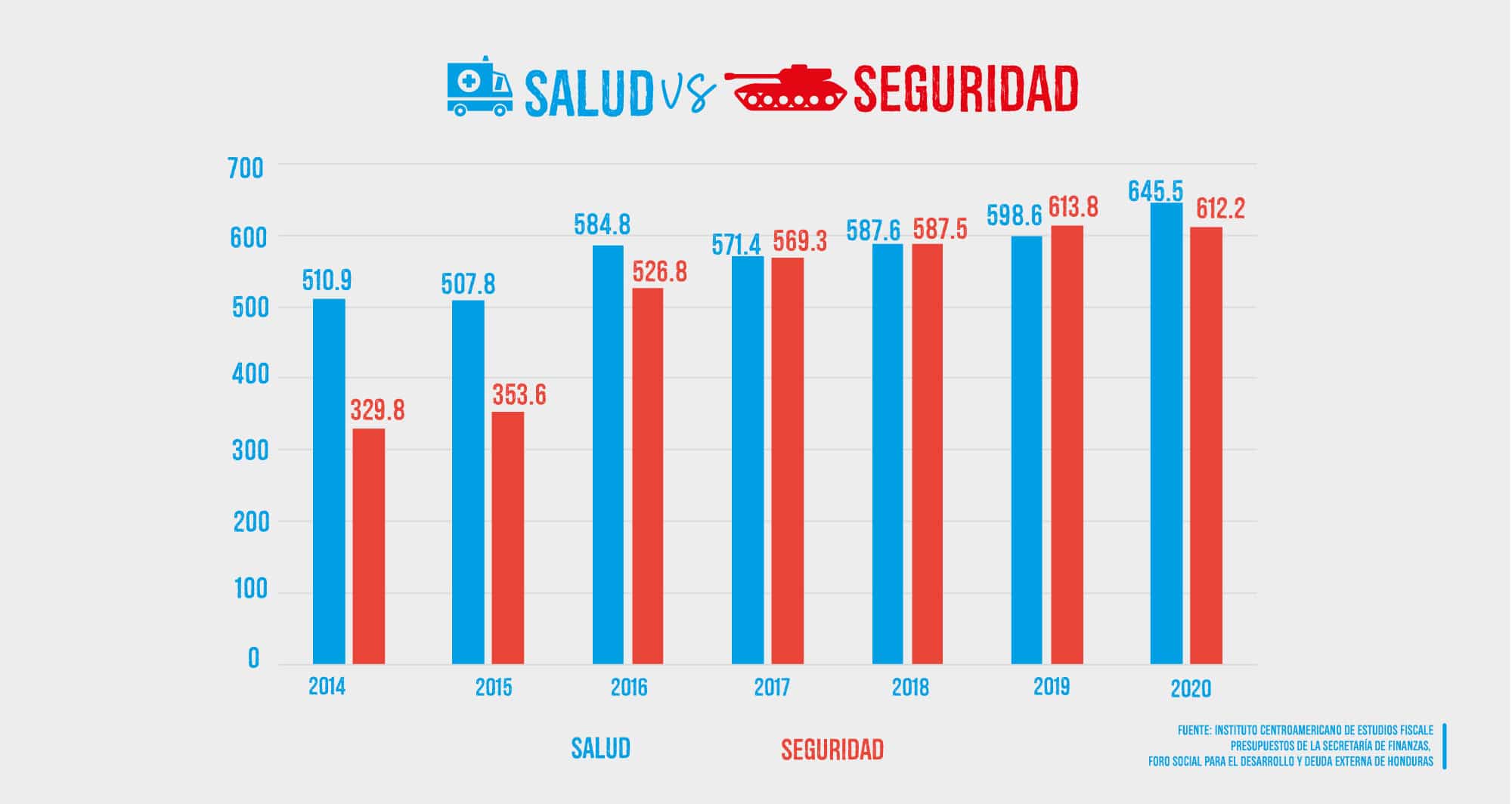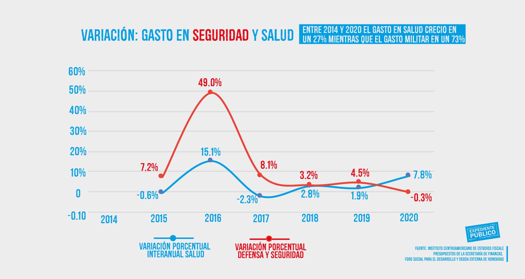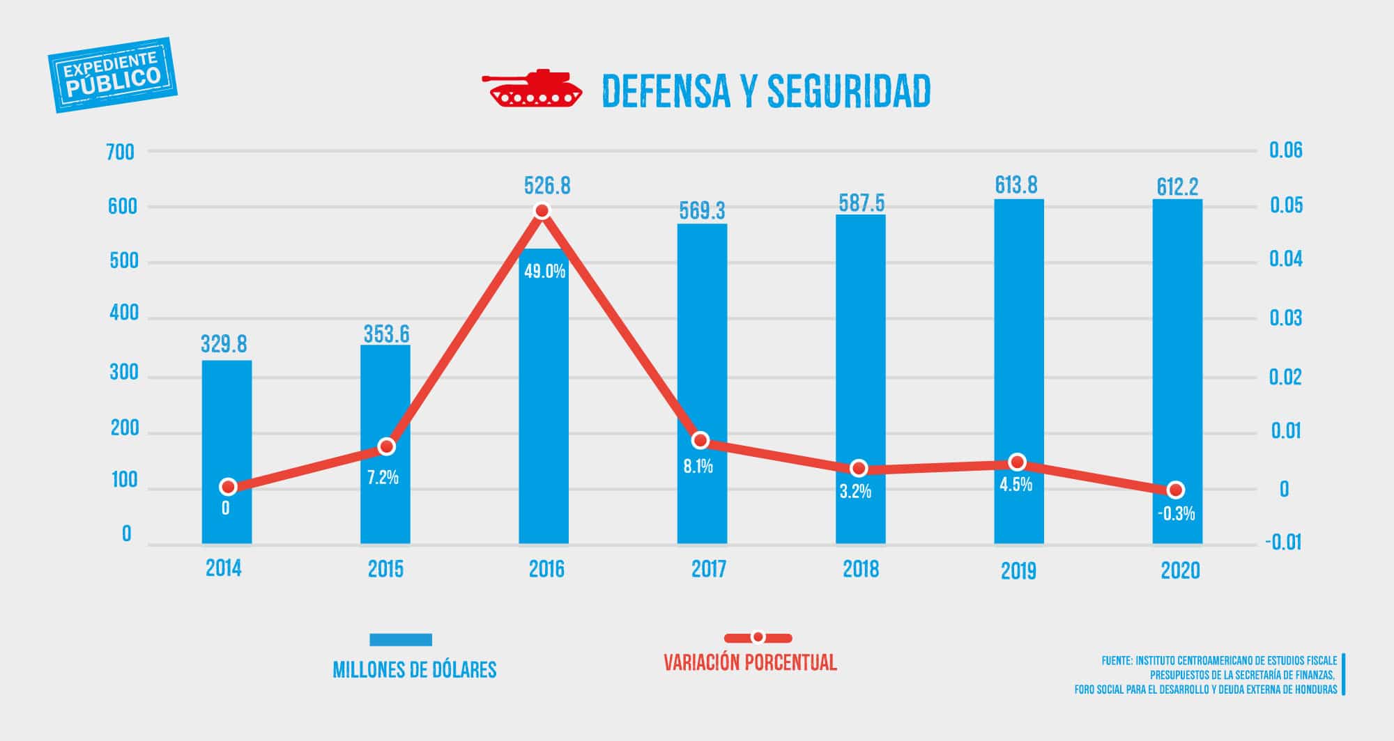 Esa inversión en equipo militar no es aislada, forma parte de la política del gobierno de Juan Orlando Hernández. En su primer año de gobierno, el 2014, el presupuesto en Defensa y Seguridad era de 329,8 millones de dólares, el que fue subiendo gradualmente hasta llegar a un pico máximo de 613,8 millones de dólares en el 2019, para un crecimiento de 86.1 por ciento. En el 2020 el presupuesto bajó levemente, a 612.2 millones de dólares.
