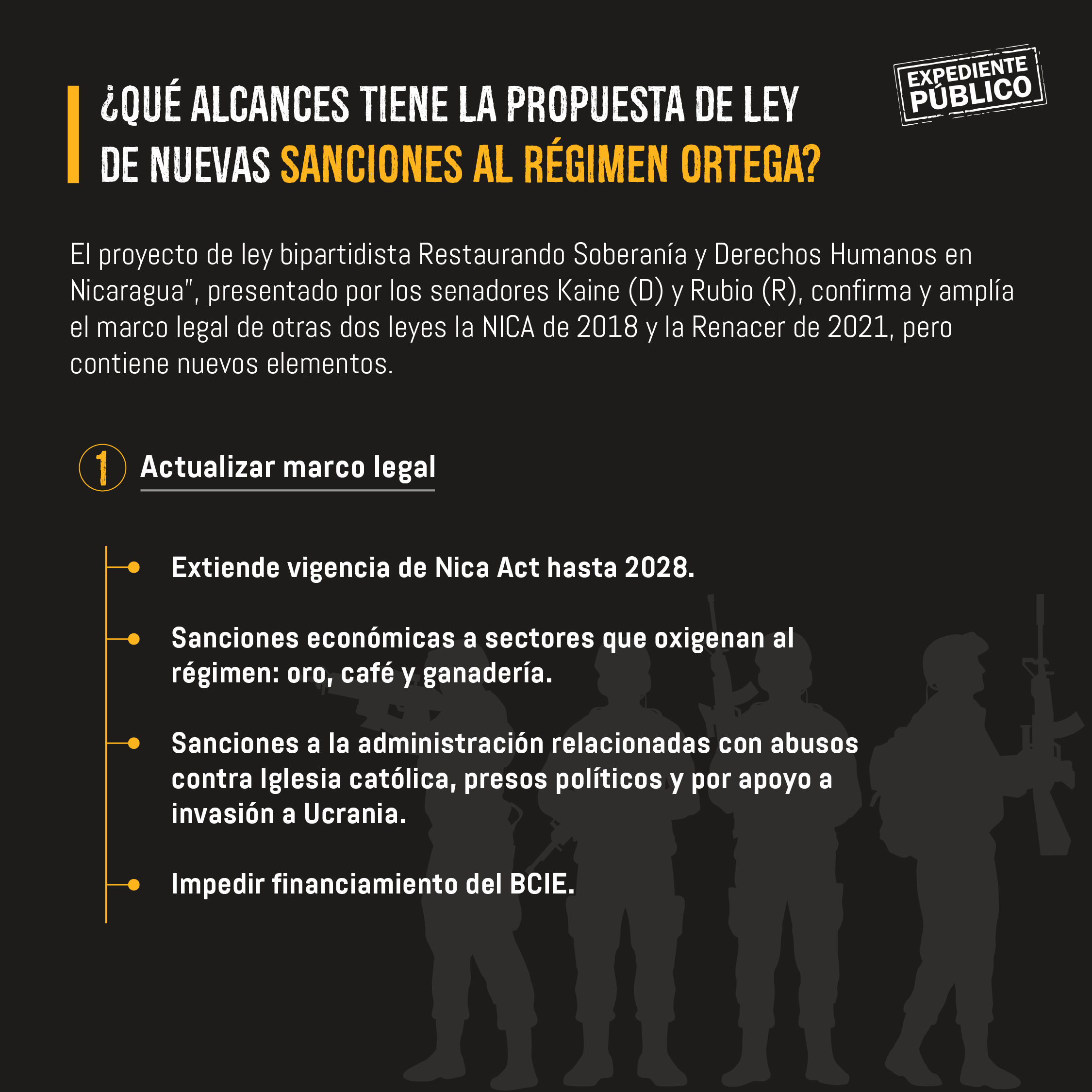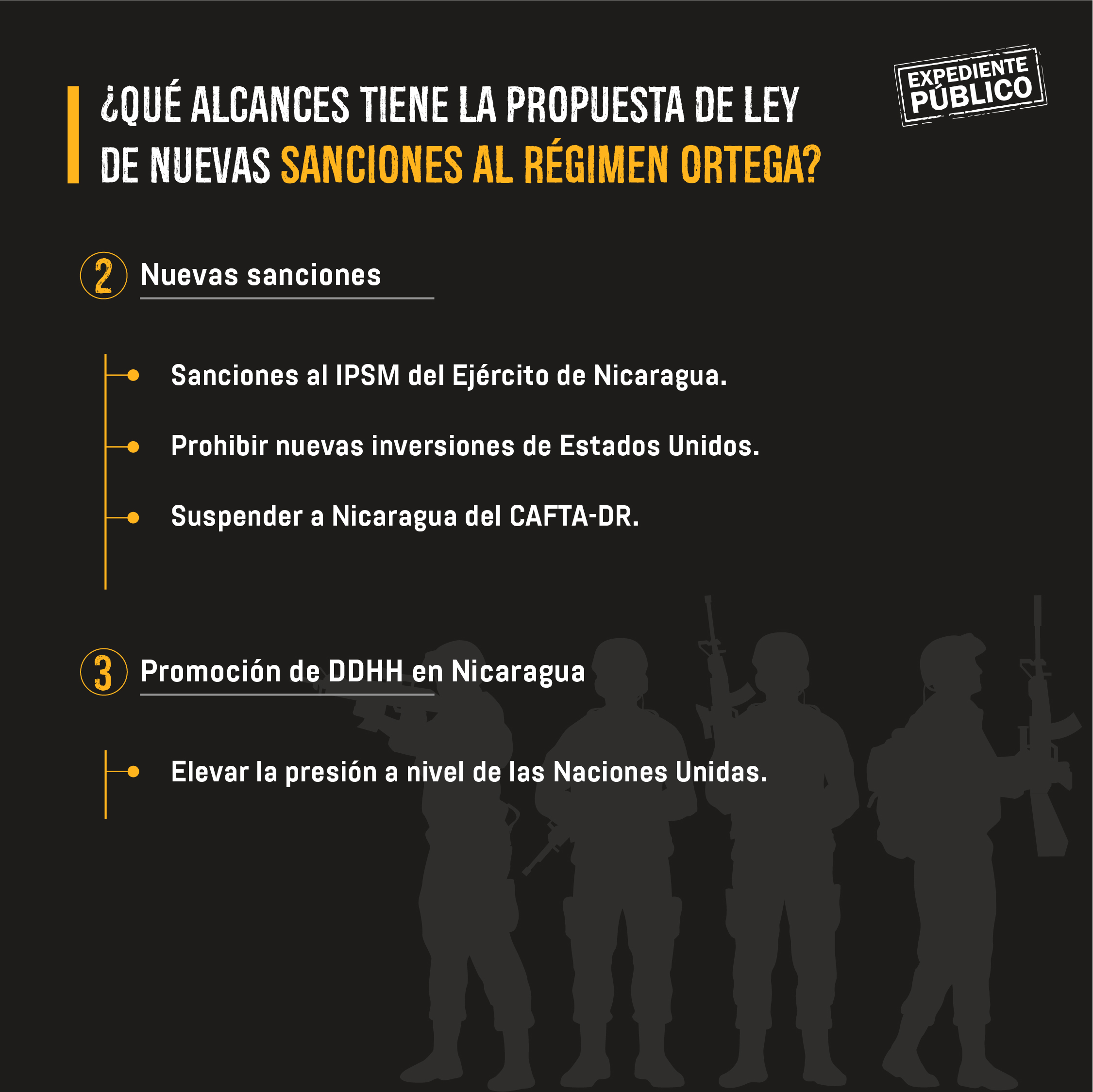 El proyecto de ley bipartidista S.1881 amplía la vigencia de la Nica Act hasta 2028, pide sanciones específicas al Instituto de Previsión Social Militar del Ejército, además prohibiría nuevas inversiones de Estados Unidos en el Nicaragua.